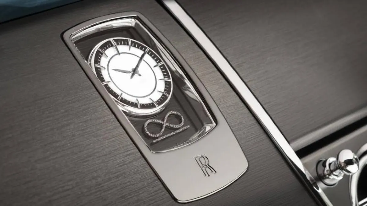 أمَّا في المقصورة، فتنجذب الأنظار إلى الساعة المُرصَّعة بالماس الأسود.