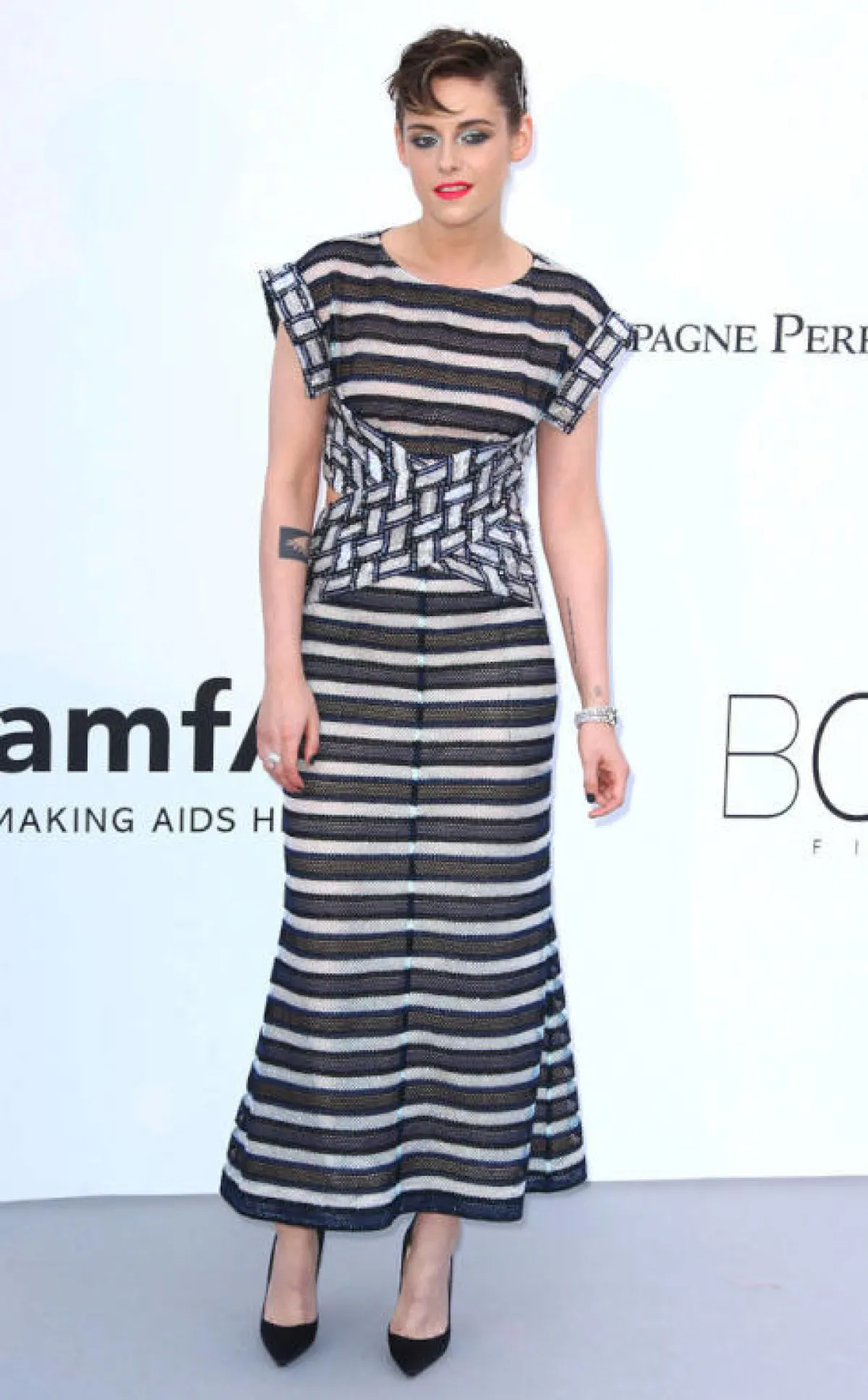 نبدأ مع اطلالة النجمة الشابة “كريستن ستيورات” Kristen Stewart التي اختارت اطلالة أقل من عادية من دار شانيل Chanel عبارة عم فستان مقلم باللونين الفضي والأسود بدا تصميمه غير مناسب للحدث.