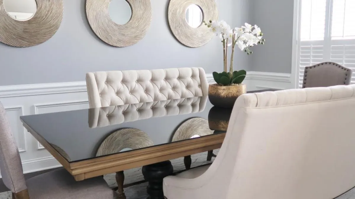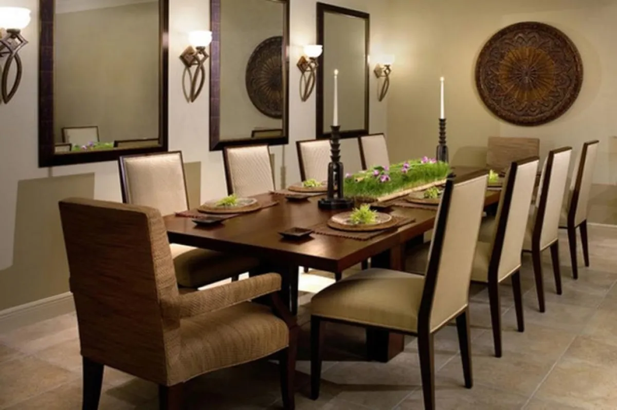 4. غرف الطعام تعدُّ من بين الأماكن الأكثر شيوعًا لوضع المرايا فيها، وخصوصًا في حضور الثريات، فتعمل حينئذ على عكس بريقها المُتلألئ.