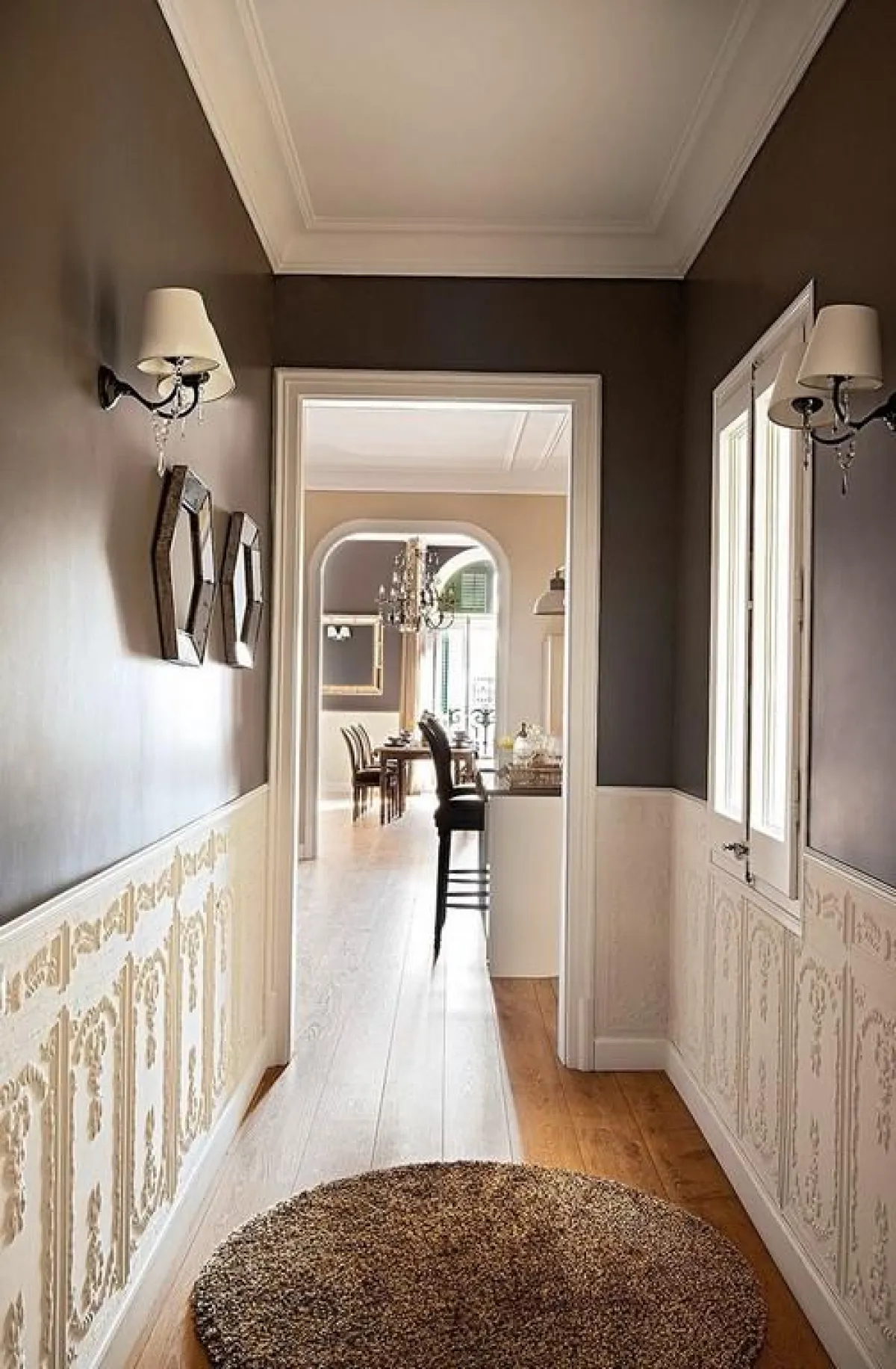 7. يُمكن استخدام مرايا صغيرة أفقيَّة في الممرَّات الضيِّقة، لإعطاء إحساس بالاتساع في الحركة بين الغرف، بالإضافة إلى المساحة التي تكسبها تلك المرايا للأمكنة المذكورة.