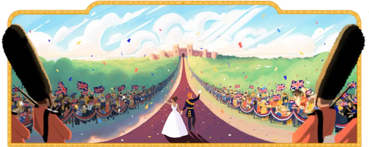 احتفى موقع البحث غوغل اليوم بالزواج البريطاني الملكي، ونشر لوحة معبرة يظهر فيها الأمير هاري حفيد الملكة إليزابيث الثانية والسادس في ترتيب ولاية العرش البريطاني، مع عروسه الممثلة الأمريكية ميغان ماركل وهما يلوحان لجموع الناس . ويُذكر أن مراسيم الاحتفال الرسمية ستبدأ في الساعة الثانية عشرة من ظهر هذا اليوم بتوقيت لندن، بعد أن تتجمع العائلة المالكة، وعلى رأسها الملكة إليزابيث الثانية، في كنيسة سانت جورج في ويندسور ( وهي مدينة تغفو على نهر التايمز وتقع جنوب شرق انكلترا ) وينضم إليها الضيوف من الرؤساء والأمراء والمشاهير ونخب المجتمع، مع قائمة مختارة تتضمن أسماء من عامة الشعب معظمهم ممن يديرون الجمعيات الخيرية . وبعد انتهاء المراسيم الرسمية، يستقل العروسان عربة ملكية تسير بهما في شوارع المدينة لمدة 25 دقيقة، تتبعها بعد ذلك حفلتا استقبال في قلعة ويندسورعلى شرف العروسين .