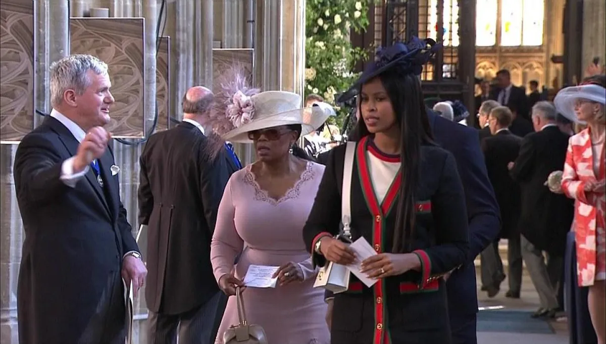 وكانت الإعلامية الأمريكية الشهيرة أوبرا وينفري Oprah Winfrey أول الواصلات إلى الحفل، حيث تألقت بفستان باللون الزهري مع قبعة على رأسها، تناسب الزفاف البريطاني تماماً.