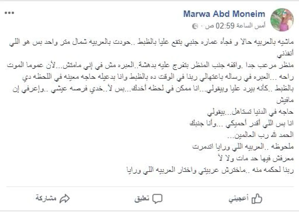 تابعت قائلة: منظر مرعب جدا واقفه جنب المنظر بتفرج عليه بدهشة، العبره مش في إني مامتش، لأن عموما الموت راحة، العبرة في رسالة باعتهالي ربنا في الوقت ده بالظبط وأنا بدعيه لحاجة معينة في اللحظه دي بالظبط، كأنه بيرد عليا وبيقولي أنا ممكن في لحظة أخدك بس لأ خدي فرصة عيشي وإعرفي إن مافيش حاجة في الدنيا تستاهل بيقولي انا بس اللي أقدر أحميكي ...وأنا جنبك الحمد لله رب العالمين.