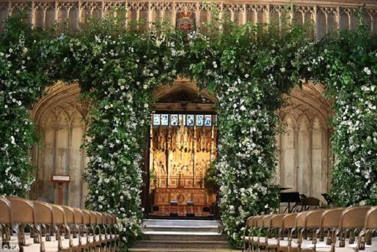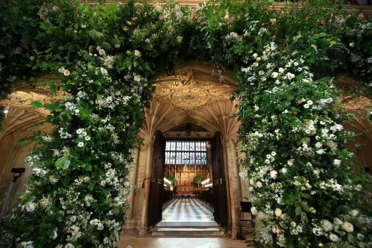 وزينت الورود أنحاء كنيسة سانت جورج وشرفاتها وأبوابها واستخدمت منسقة الزهور فيليبا كرادوك وروداً بيضاء وزهور الفاونيا وأعواد نباتات الزان والبتولا وشجرة النير والتي جمعت من حدائق ومتنزهات وندسور وفقاً لما ذكره المكتب الإعلامي للأسرة المالكة.
