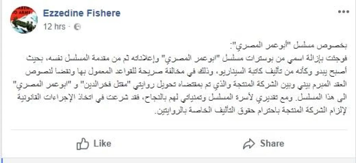 يواجه مسلسل "أبو عمر المصري" تهدد بوقف عرضه أزمة تهدد بوقف عرضه حيث نشر الكاتب والروائي الشهير عز الدين شكري فشير عبر حسابه على موقع التواصل الاجتماعي فيس بوك منشور قال فيه: بخصوص مسلسل "أبوعمر المصري، فوجئت بإزالة اسمي من بوسترات العمل وإعلاناته ثم من مقدمة المسلسل نفسه، بحيث أصبح يبدو وكأنه من تأليف كاتبة السيناريو، وذلك في مخالفة صريحة للقواعد المعمول بها ونقضا لنصوص العقد المبرم بيني وبين الشركة المنتجة والذي تم بمقتضاه تحويل روايتي "مقتل فخرالدين" و "ابو عمر المصري" الى هذا المسلسل. ومع تقديري لأسرة المسلسل وتمنياتي لهم بالنجاح، فقد شرعت في اتخاذ الإجراءات القانونية لإلزام الشركة المنتجة باحترام حقوق التأليف الخاصة بالروايتين.