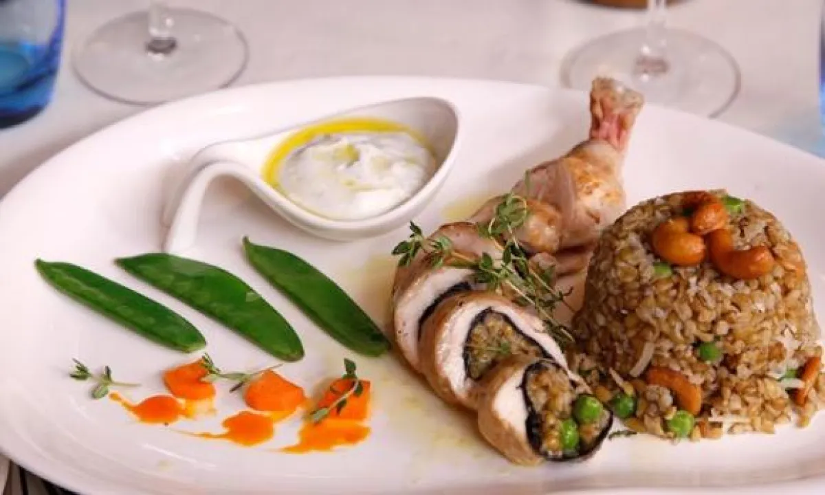 2- يحشى الدجاج بقليل من الفريك، ويلف على شكل أسطوانة، ويقدم مع الفريك والخضراوات المسلوقة.