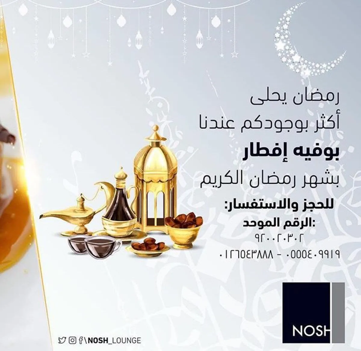 يتمتع نوش لاونج بقائمة طعام عالمية يعدها أمهر الطهاة بأجواء تجمع بين الطابع الكلاسيكي والحديث، وفي شهر رمضان يقدم بوفيه للإفطار بجميع الأصناف.