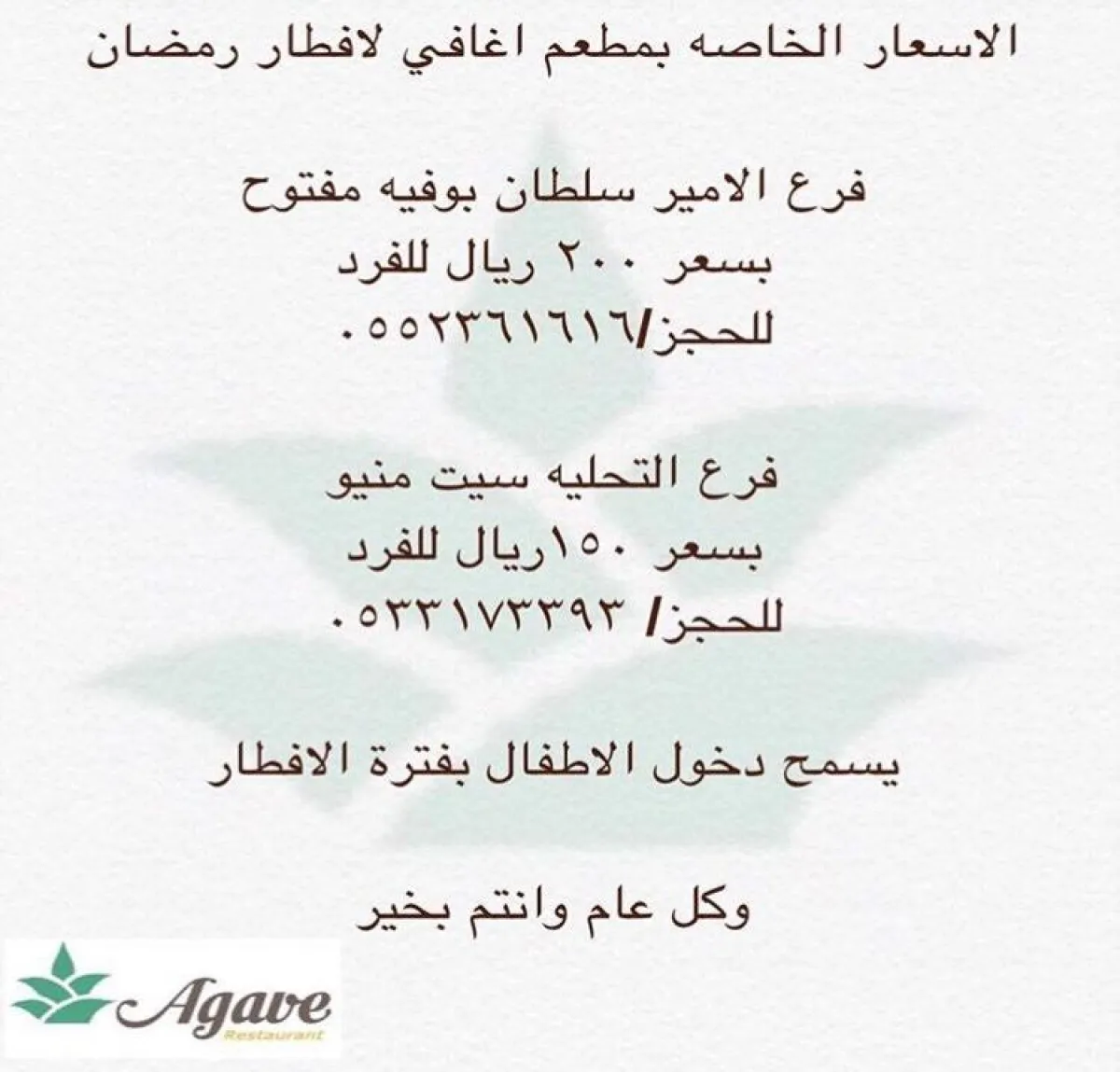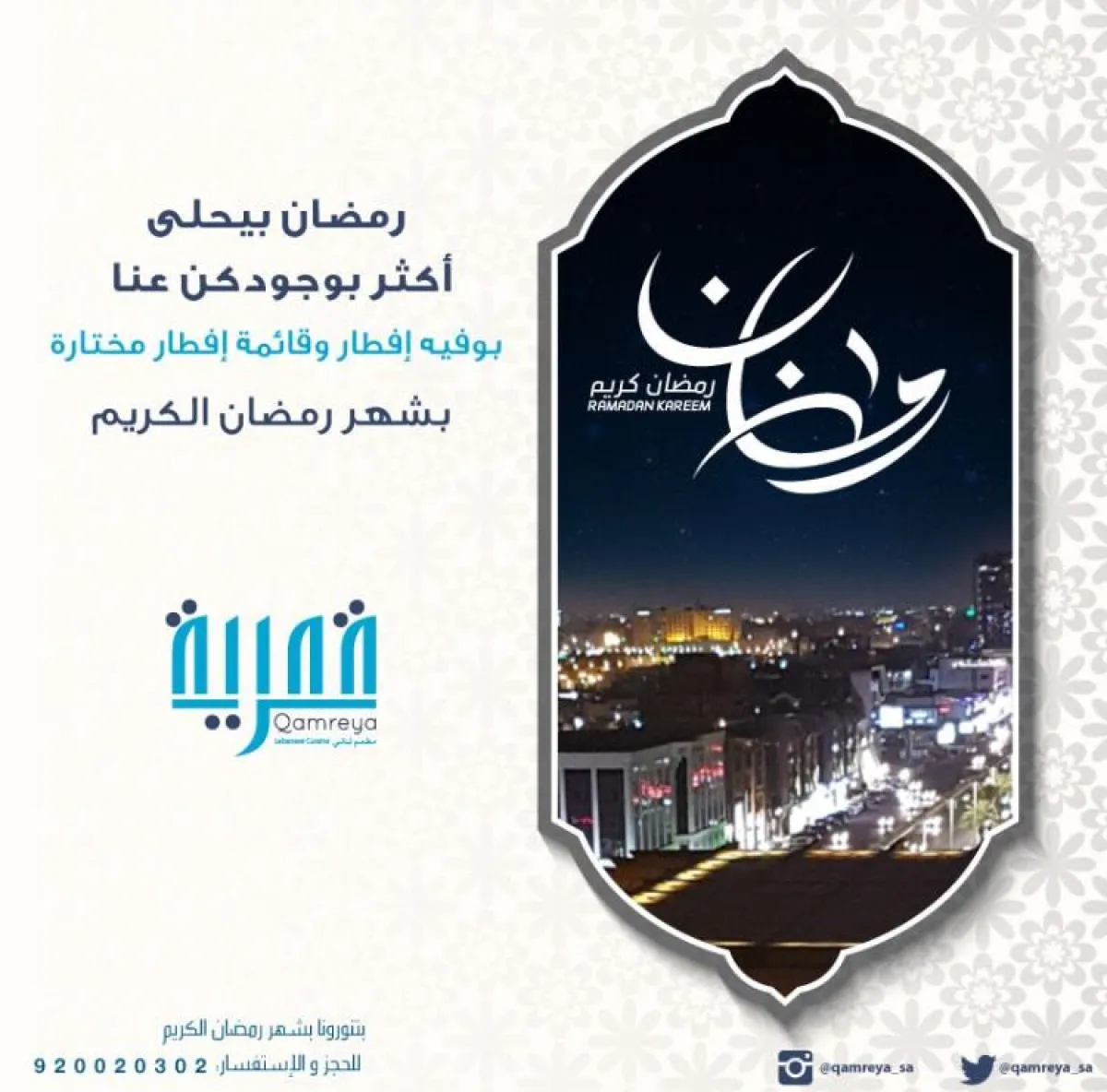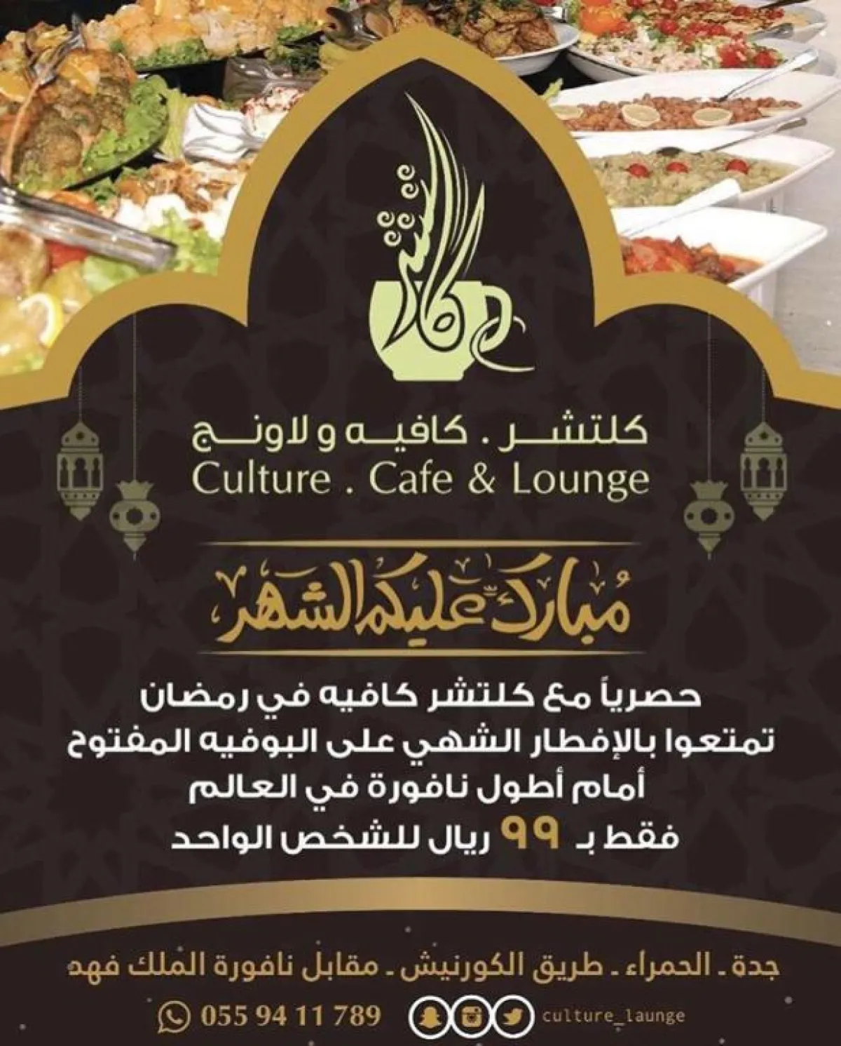 مطعم وكافي يقدم أشهى المأكولات الرمضانية والعالمية، يمكن زيارته مع العائلة أو مع الأصدقاء لإفطار لذيذ ومتنوع، في رمضان يقدم المطعم عرضان للإفطار.