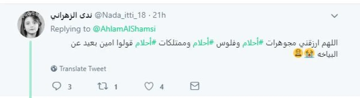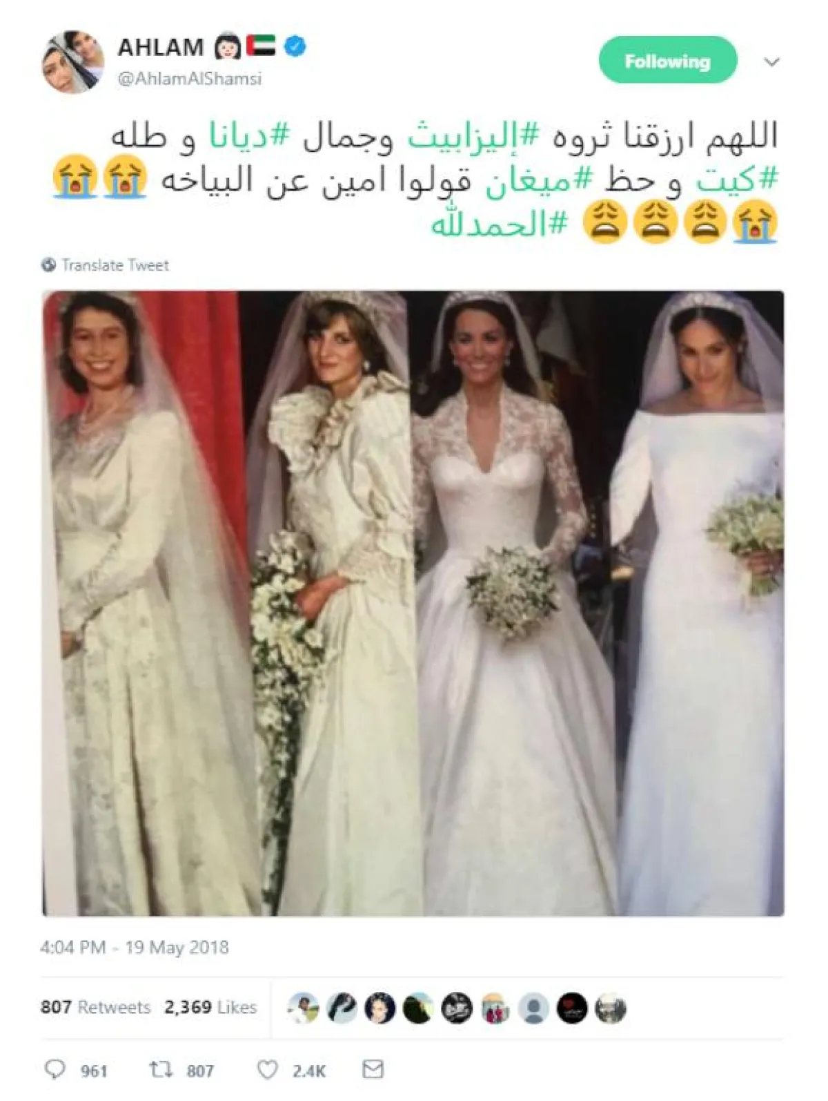 تغريدة أحلام جاءت ضمن تفاعل النجوم مع حفل الزفاف الملكي الذي تصدر موقع تويتر، ونشرت أحلام صورة م للملكة إليزابيث والأميرة ديانا وكيت مديلتون وميجان ماركل بفساتين الزفاف وعلقت عليها بقولها: اللهم ارزقنا ثروة إليزابيث وجمال ديانا وطلة كيت وحظ ميجان.. قولوا آمين.