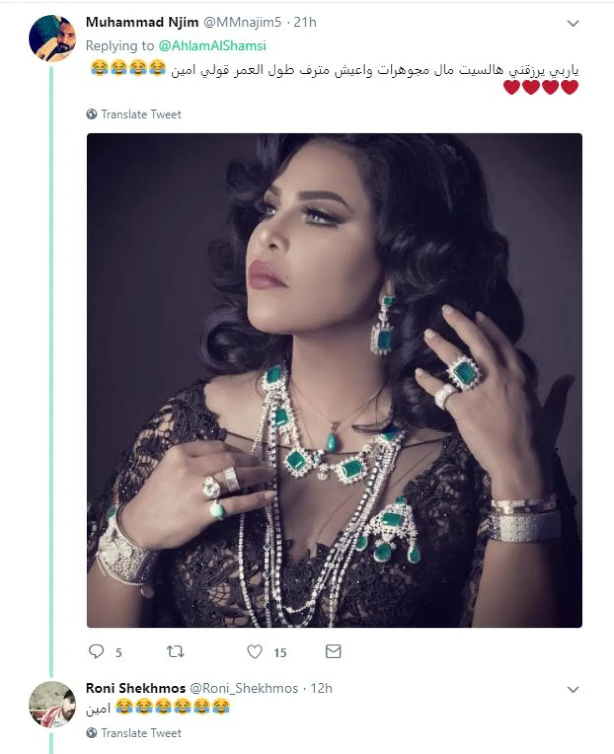 جمهور أحلام بادلها الأمنيات ولكن على طريقته الخاصة، فتبارى أغلبهم في نشر صور للمطربة الاماراتية مع مجوهراتها الفاخرة، وألحقت بكل صورة أمنية الحصول على هذه المجوهرات، فقالت مغردة: اللهم ارزقنا جوهرة من جواهر احلام عالاقل الواحد يحقق احلامو، وقال آخر: اللهم ارزقني مجوهرات #أحلام وفلوس #أحلام وممتلكات #أحلام قولوا امين!!