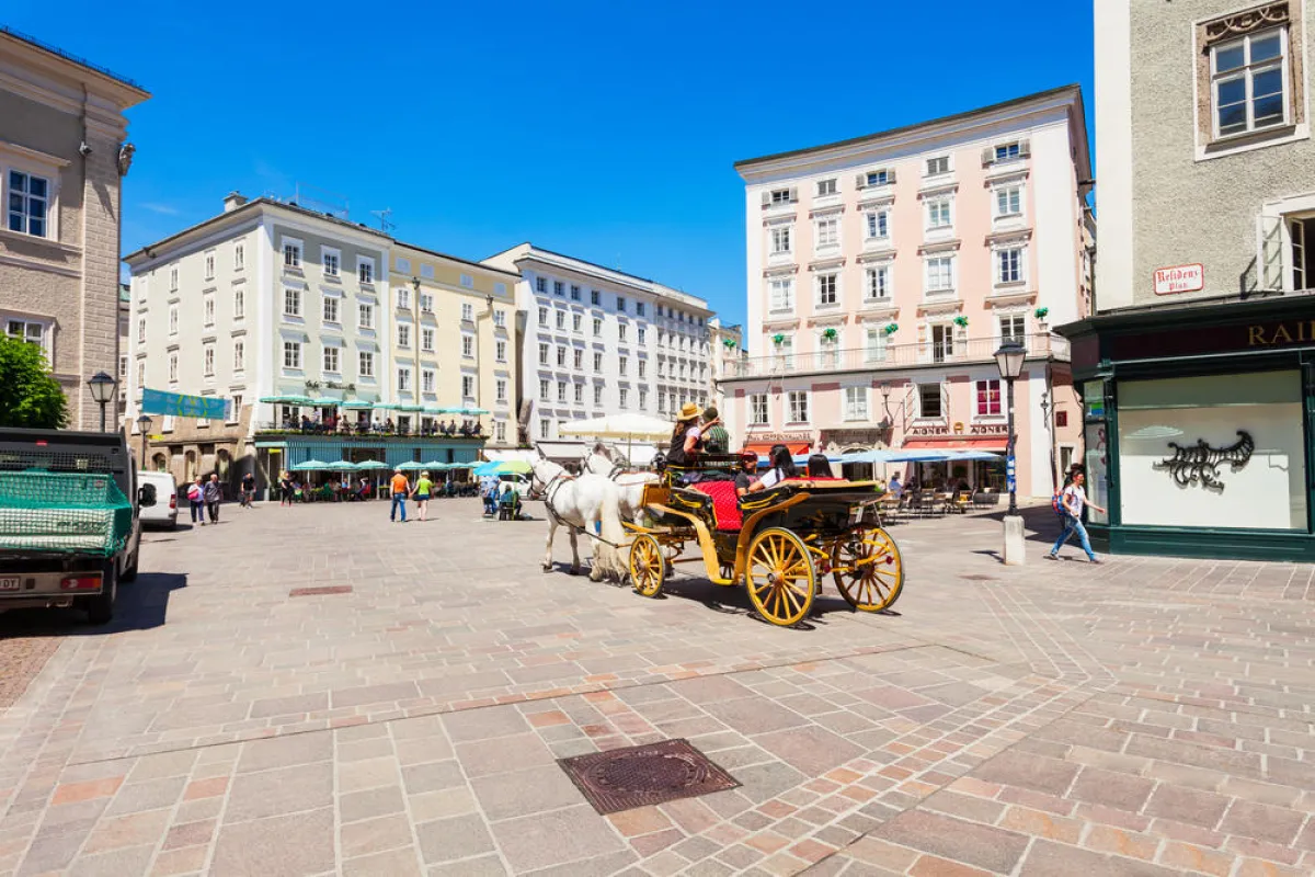 | "رزيدينسبلاتس": تتوسَّط هذه الساحة مدينة سالزبورغ القديمة، وتحيط بها مساكن رئيس الأساقفة وصرح سالزبورغ الديني والمنازل الريفيَّة المشغولة من المحلات التجارية والمطاعم. وهي أيضًا المكان الذي يمكِّن زائريه من ركوب عربات تجرُّها الأحصنة، في رحلات عبر شوارع المدينة القديمة. وثمة نافورة ، يُقال إنها الأكثر جمالًا في سالزبورغ ، في الساحة.