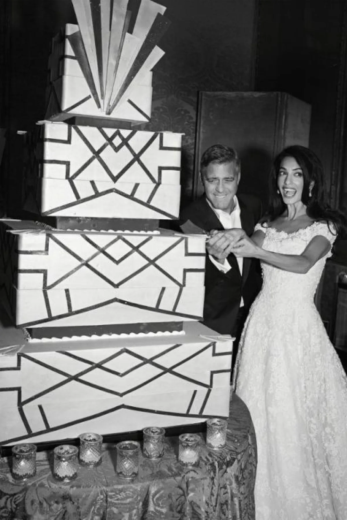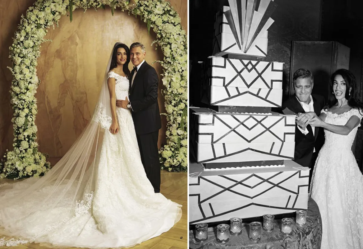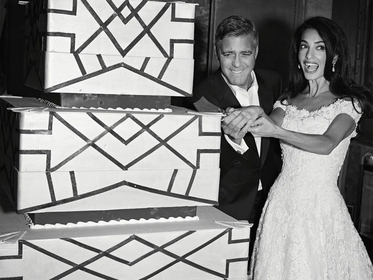 إن كان زفافكِ يحمل الطابع الجنوني أو غير التقليدي، يمكنكِ اختيار كعكة زفاف مشابهة لكعكة المحامية الشهيرة أمل علم الدين ونجم هوليوود جورج كلوني، باختيار كعكة زفاف مربعة الشكل، مع خطوط وتصاميم هندسية عصرية وجاذبة.