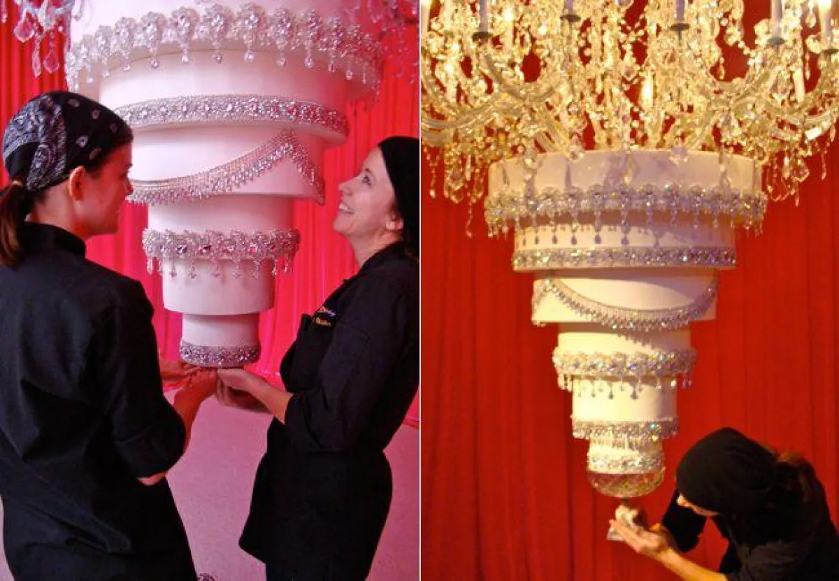 كما لفتنا أيضًا كعكة رايان سويتنغ و كالي كوكو غير التقليدية، فلم يفهم المعازيم لأول وهلة، هل هذه كعكة زفاف، أم ديكور، بعمل كعكة زفاف معلقة على النجفة، والتي استغرقت ساعتين لتعليقها، بالإضافة إلى أنّ الكعكة بدت وكأنها تحفة فنية مزينة بالاكسسوارات اللامعة الفضية.