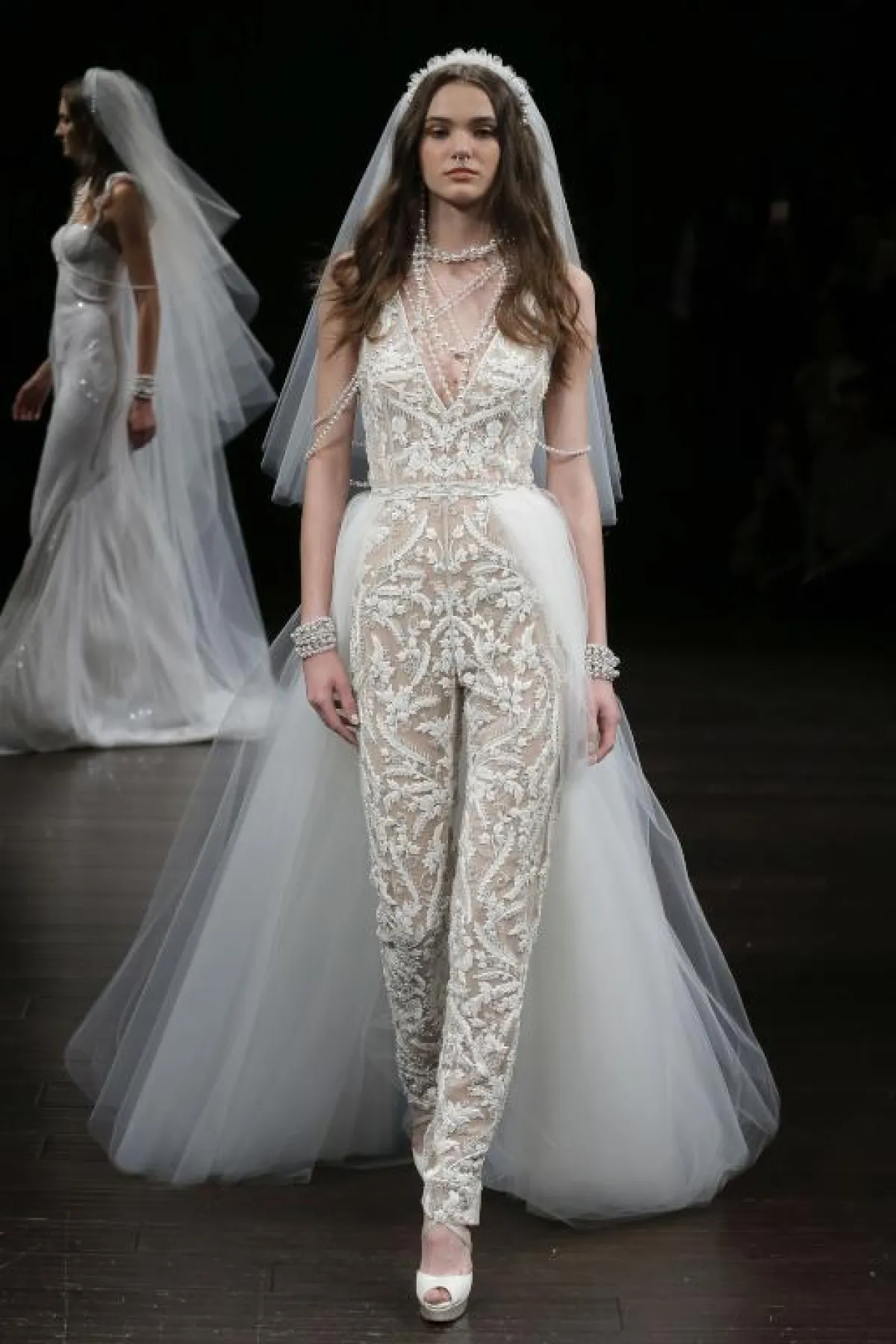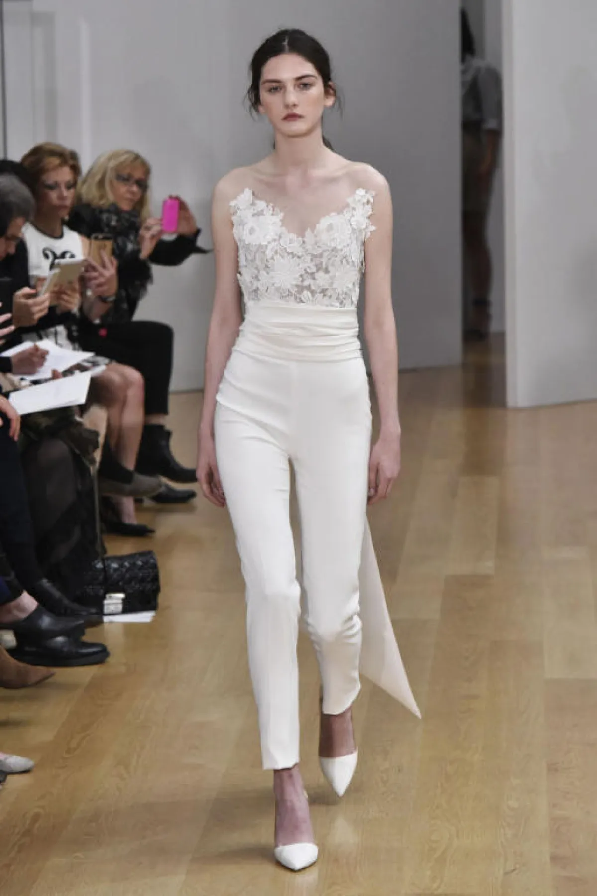 لم يعد فستان الزفاف هو الخيار الوحيد بالنسبة لعروسات عام 2018 الجريئات منهن بشكل خاص، حيث أصبح هنالك تصاميم الجمبسوت باللون الأبيض، أو تنسيقات السروايل مع سترات البليزر، أو التصميم الذي يجمع بين الجمبسوت والفستان في آن واحد، وهذه التصاميم شاهدناها بكثرة ضمن مجموعات موسم ربيع وصيف 2018 وقد بدت مبتكرة ولافتة الى حل بعيد.