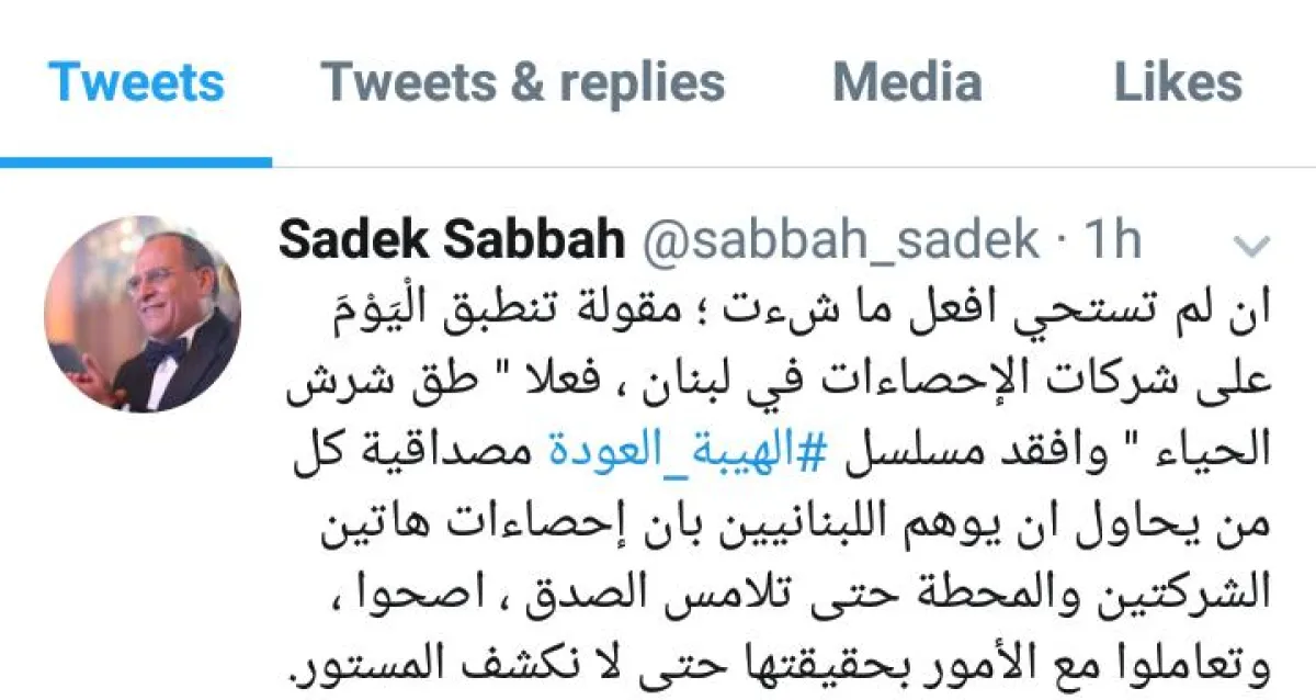 تهديد المنتج صادق الصباح، صاحب شركة "الصباح للإعلام" للإنتاج، جاء عبر تغريدة نشرها على "تويتر"، قال فيها" إن لم تستح فافعل ما شئت، مقولة تنطبق اليوم على شركات الإحصاءات في لبنان، فعلاً" طق شرش الحياء" وأفقد مسلسل الهيبة العودة مصداقية كل من يحاول أن يوهم اللبنانيين بإن إحصاءات هاتين الشركتين والمحطة حتى تلامس الصدق، إصحوا وتعاملوا مع الأمور بحقيقتها حتى لا نكشف المستور".