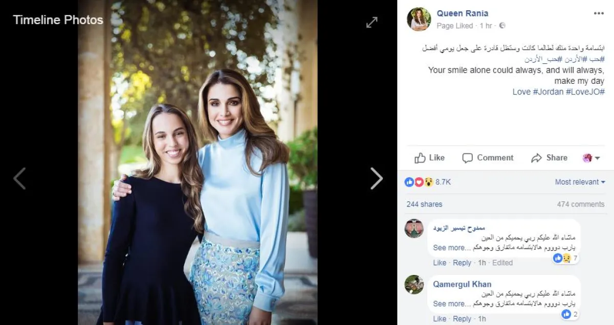 نشرت الملكة رانيا العبد الله عبر صفحتها الرسمية على موقع التواصل الإجتماعي "فيسبوك"، صورة جمعتها بابنتها الأميرة إيمان بنت عبد الله الثاني بن الحسين، وكتبت الملكة تدوينة معلقة على الصورة التي جمعتهما قائلة: