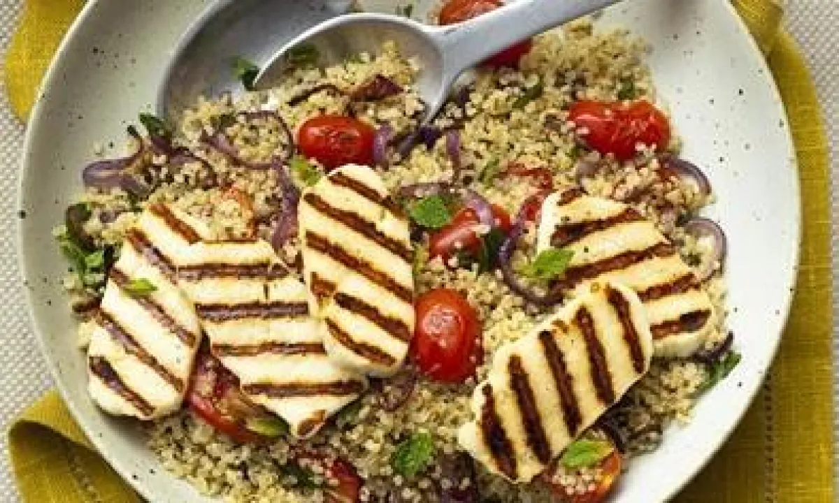3-في هذه الأثناء، تسخّن المشواة. يقطّع جبن الحلّوم إلى 6 شرائح رقيقة، تقلى في مقلاة شبكية أو تحت المشواة لمدّة دقيقة على كل جانب.