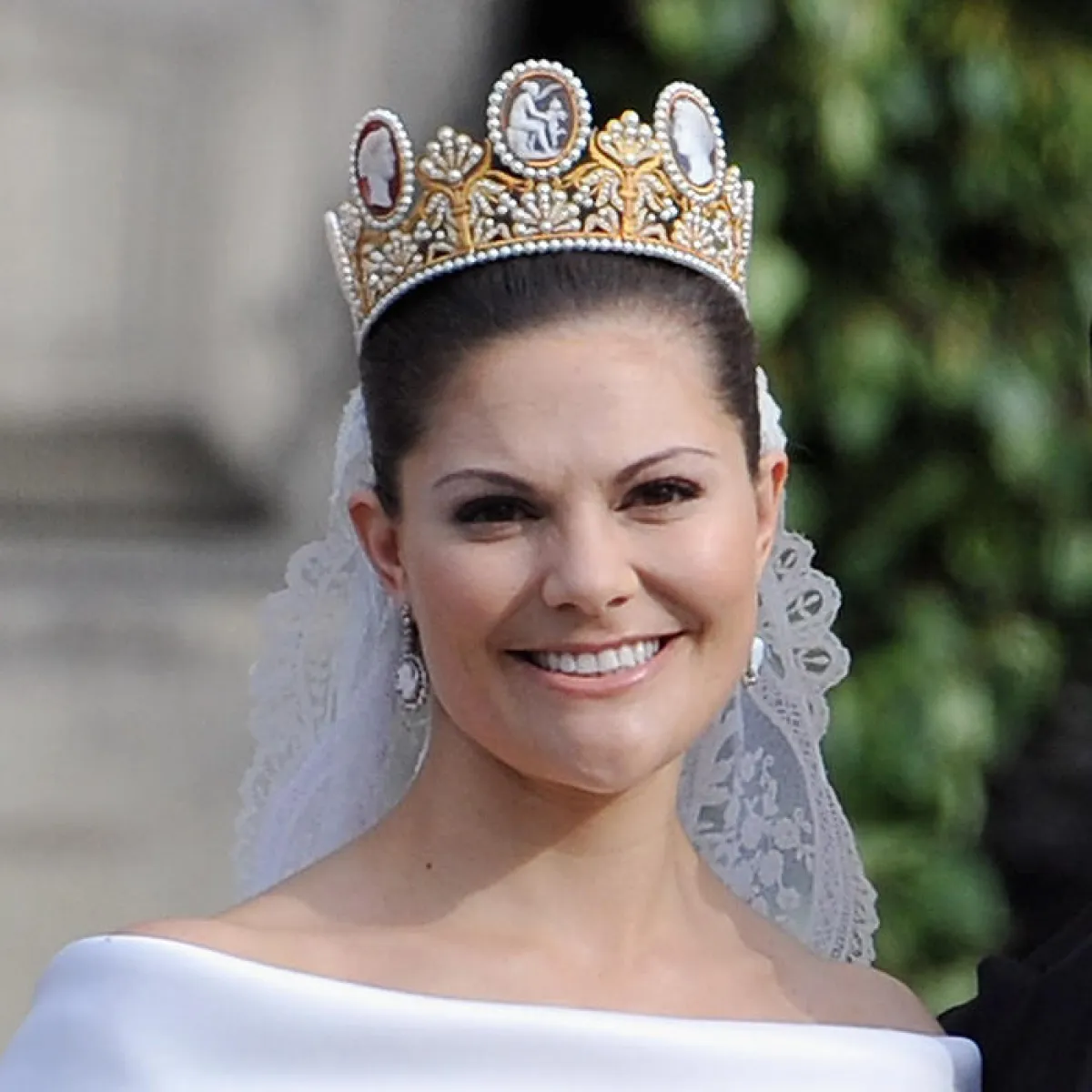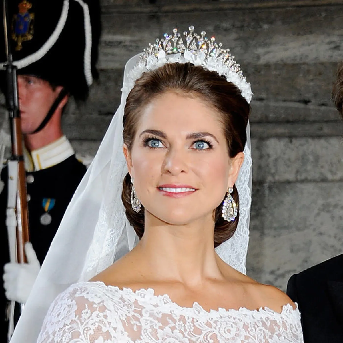 أميرة السويد مادلين اختارت تاجًا ملكيًّا فخمًا بالشكل التقليدي، مرصّعًا بالأحجار، مع اللؤلؤ، كبير الحجم، مع قطع الأحجار الماسية المستديرة.