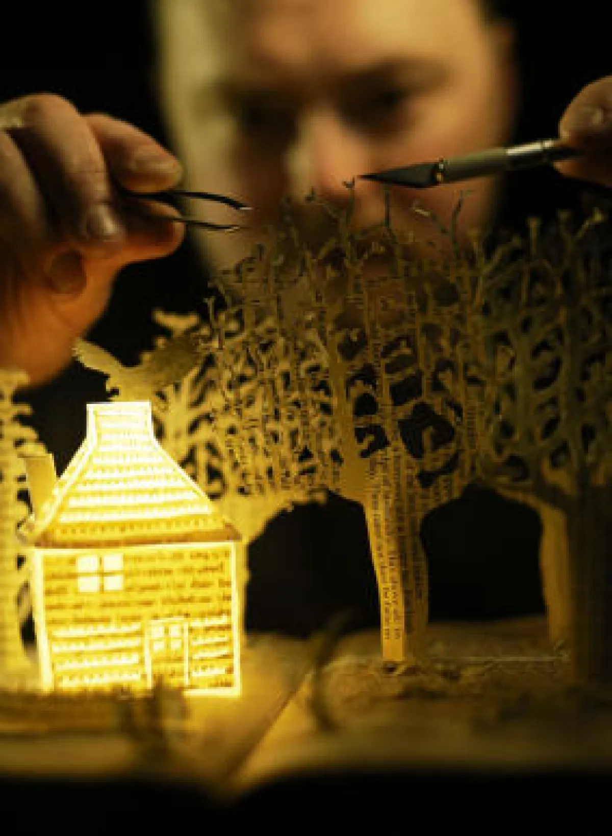 عندما يكون الفن يمشي في عروق الإنسان لن يوقفه أي أحد عن ابتكار كل ما هو جديد، وهذا ما أثبته جستن رو البالغ من العمر 41 عامًا، والمسؤول عن مكتبة جامعة "كامبريدج" قسم الصحافة عندما بدأ مشواره الفني بنحت المشاهد الطبيعية والشخصيات على أوراق الكتب بطريقة مجسمة، واستخدم لهذه الغاية شفرة حادة خاصة بالورق. وبحسب ما نشرته صحيفة "مترو" البريطانية أنّ جستن استخدم الكتب القديمة المهترئة التي اشتراها من أحد الباعة في طريقه للعمل، ويعتقد أنها تحوّلت من مجرد وسيلة ترفيه إلى أسلوب حياة بالنسبة له، مشيرًا إلى أنّ إدارة الجامعة ستنظم لأعماله الفنية معرضًا مجانيًّا كجزء من النشاطات في أسبوع الأدب في جامعة "كامبريدج".
