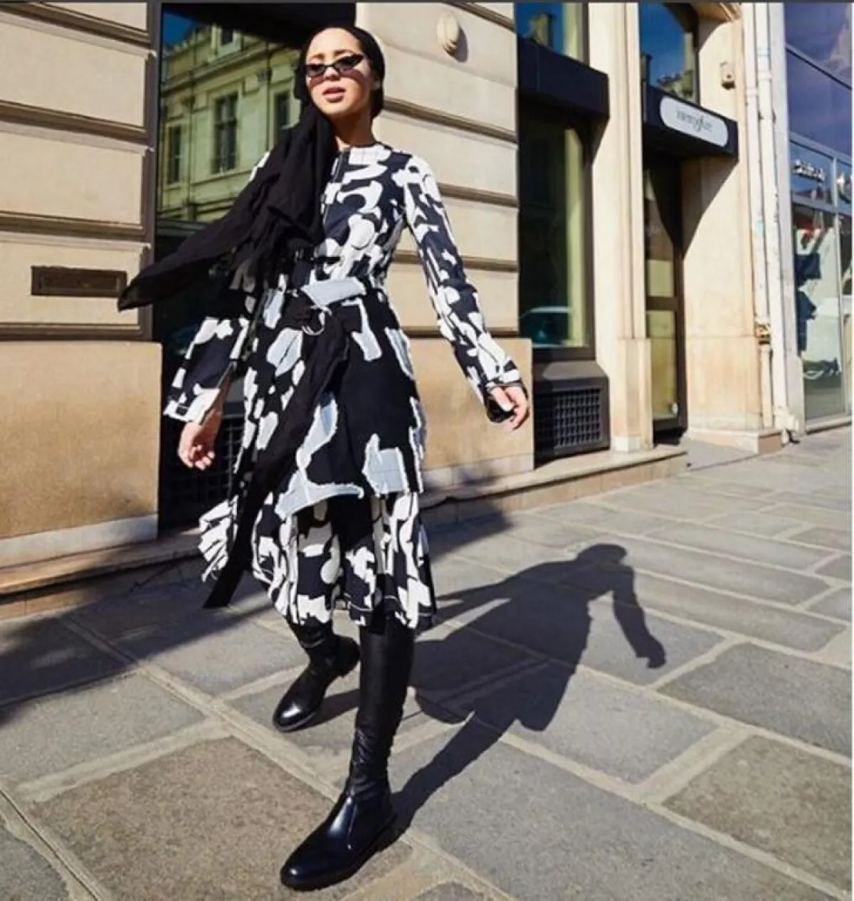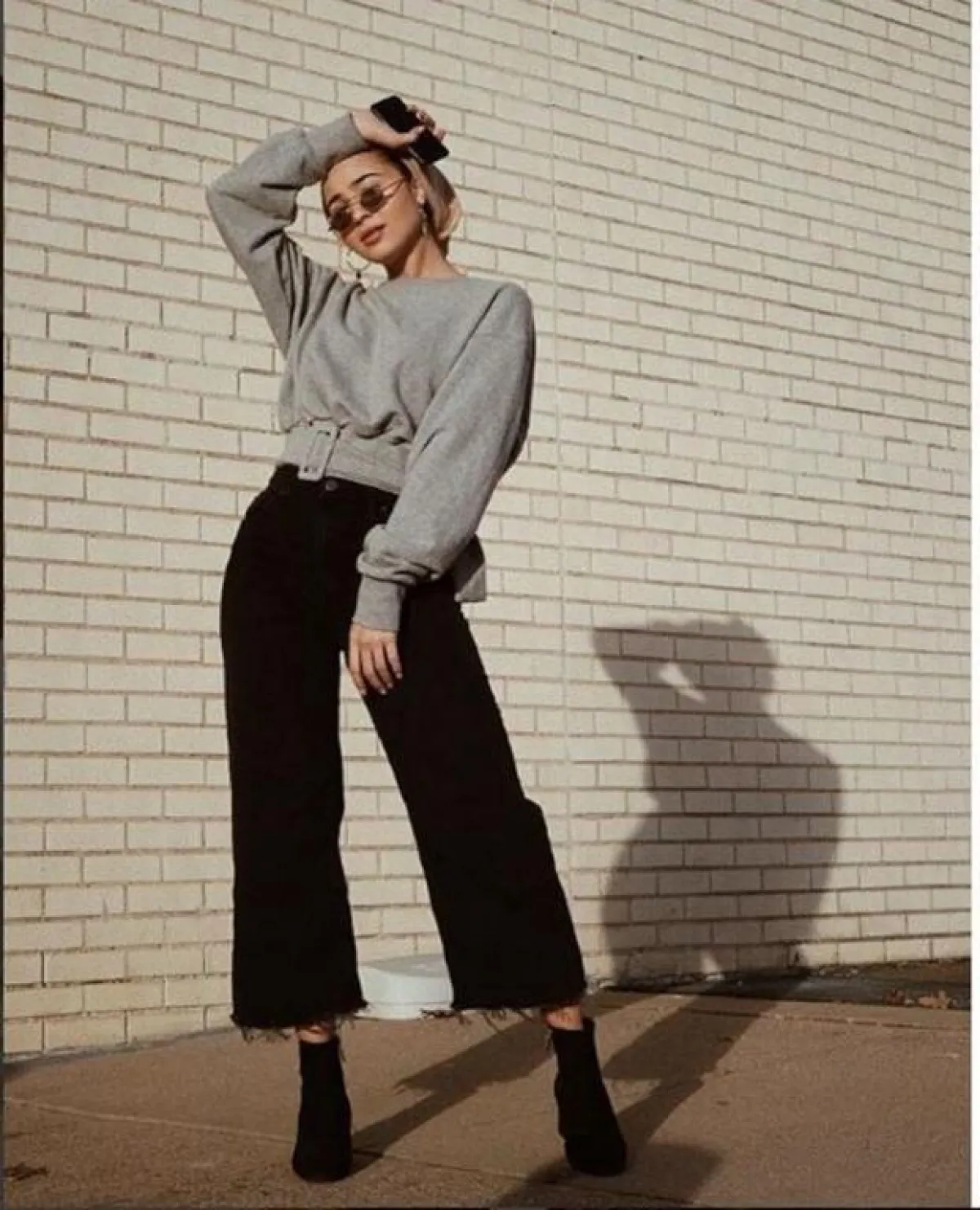 تميل الفاشنيستا ماريا إلى صيحات الكاجوال بشكل كبير، فهي تختار الجينز بكافة أشكاله وألوانه، مثل هذا البنطلون الشارليستون الواسع الأسود القصير، مع بلوزة رمادية أنيقة، واختارت الهاف بوت باللون الأسود لإطلالة عصرية.