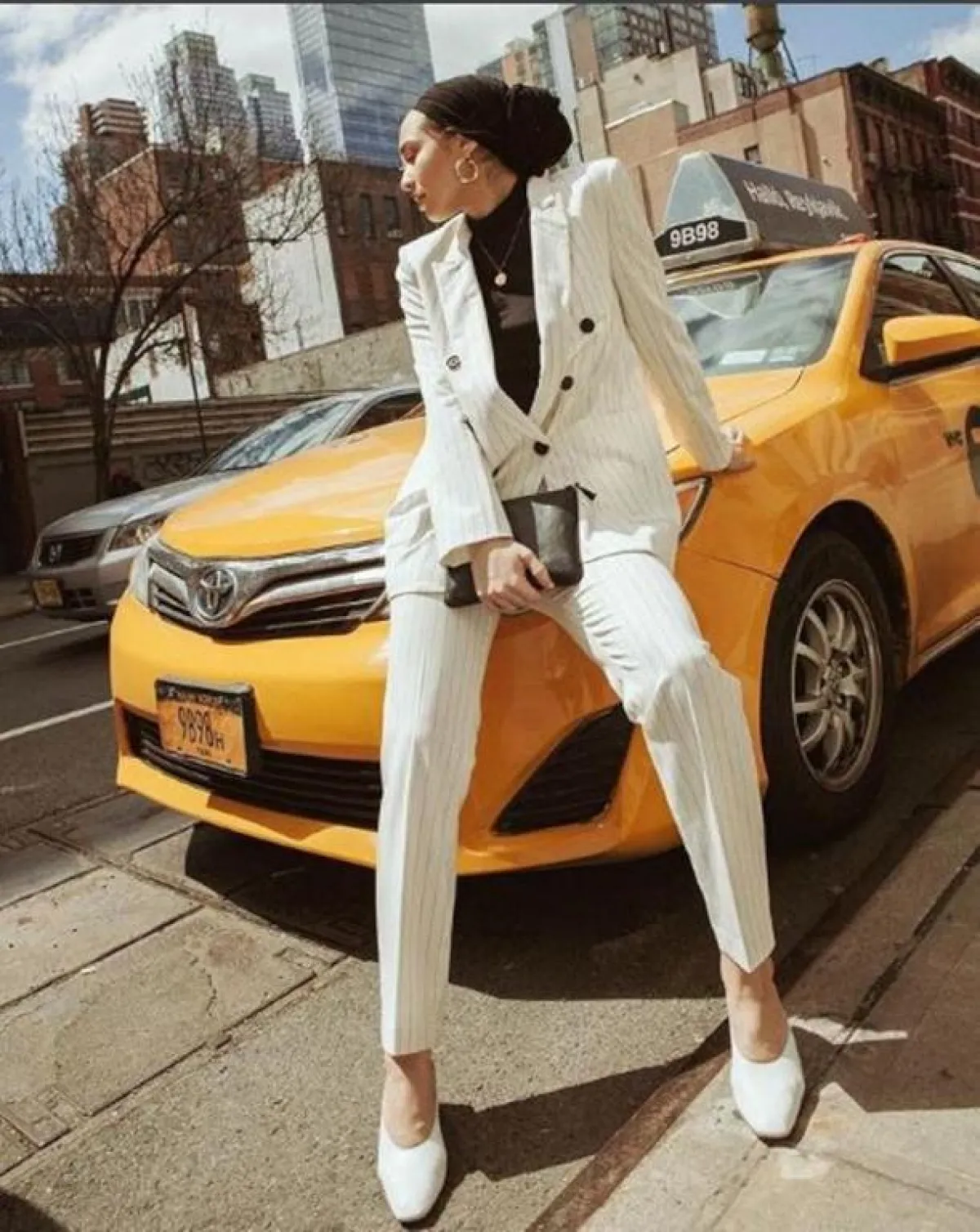 لفتنا أيضًا القميص الكلاسيكي، مع البنطلون الأسود عالي الخصر، لإطلالة أكثر نحافة، مع إكسسوار الحلق المتدلي.