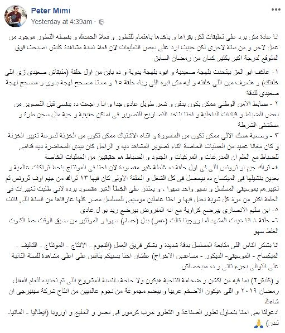 بعد تزايد السخرية من الأخطاء الساذجة المتكررة في حلقات مسلسل "كلبش 2"، خرج مخرج العمل بيتر ميمي عن صمته، وأطلق بيانا توضيحيا، موجها لجمهور المسلسل المتصدّر لنسب المشاهدة في الأيام التسعة الأولى من شهر رمضان، مؤكدا أنه استفاد من بعض الملاحظات ولكن هناك انتقادات في غير محلها، مشيرا إلى مراجعة تفاصيل حياة ضباط الداخلية أثناء تصوير العمل.