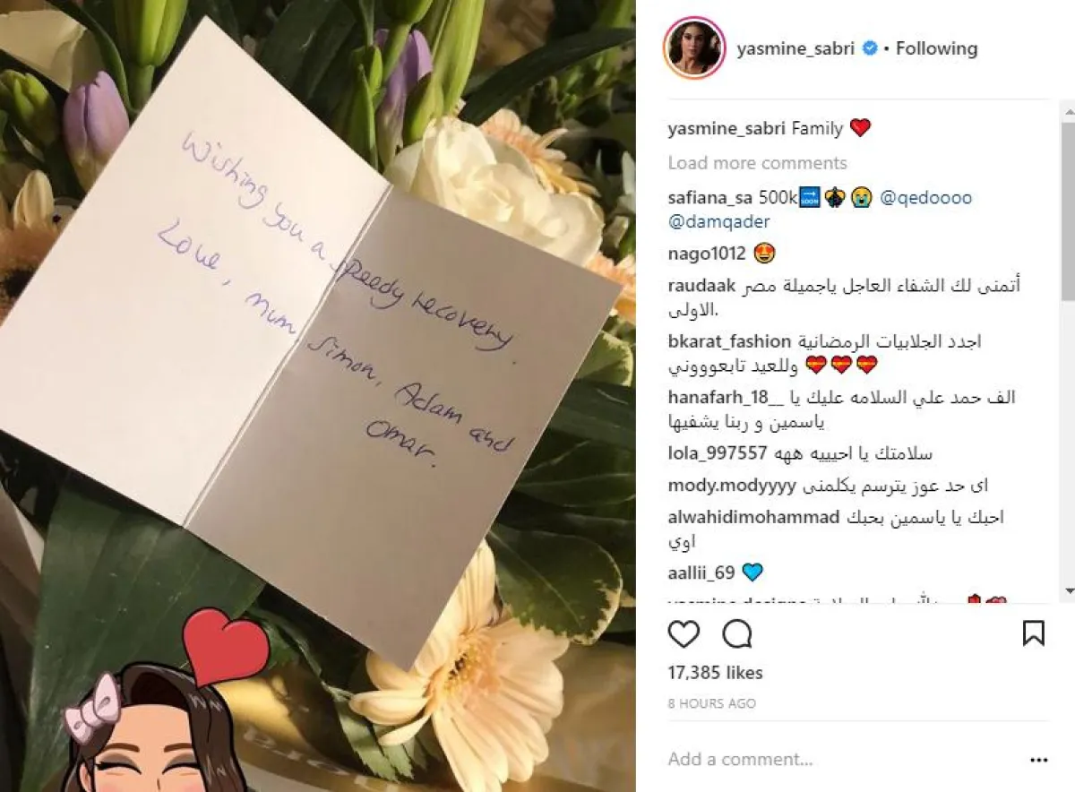 الصورة التي أثارت قلق الجميع لم تظهر فيها ياسمين صبري نهائياً، كما لم تظهر طوال الشهر الفضيل بعد عرض حلقتها ببرنامج "رامز تحت الصفر" وفضلت عدم التعليق على اتهامها بالمشاركة في فبركة مقلب رامز جلال، كما رفضت التعليق على صورة "باقة الورد" ولكن بدا واضحاً أن بطاقة الاهداء مكتوب عليها: "نتمنى لكي الشفاء العاجل ، مع الحب ماما ، سيمون ، أدم ، عمر".