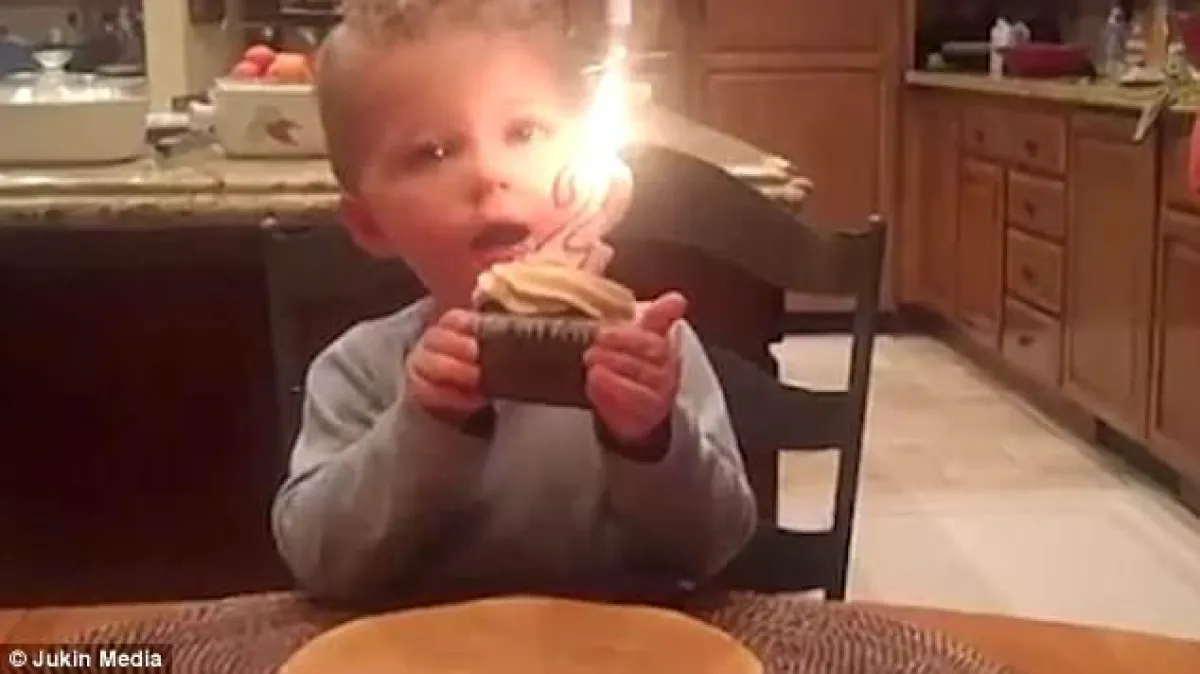 وبحسب موقع «ديلي ميل»، فإن «سوير» الصغير، من أمريكا، وضع أمامه أبواه قطعة «كب كيك» مليئة بالكريمة السميكة، وتعلوها شمعة مضاءة، رقم «اثنين» في عيد ميلاده الثاني، في حين يقوم ضيوفه بالغناء بمناسبة عيد ميلاده.