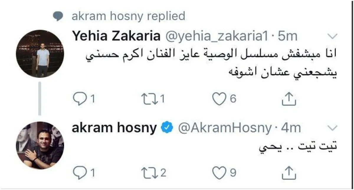 جاء ذلك عبر الرد على أحد متابعي أكرم حسني الذي كتب تغريدة يطالب أكرم حسني بتشجيعه لمشاهدة مسلسل «الوصية» ليفاجأ الشاب يحيى زكريا بردّ الفنّان أكرم حسني عليه خلال دقيقتين وتحقيقه طلبه، في طريقة فكاهية، وأيضاً في سابقة لم تحدث لأوّل مرّة للتواصل مع المتابعين، وللترويج لمسلسله الوصية. وجاءت تغريدة الشاب يحيى زكريا كالآتي: «أنا مبشفش مسلسل الوصية.. عايز الفنّان أكرم حسني يشجعني عشان أشوفه». ليرد أكرم حسني عليها بعدها بدقائق في تغريدة قائلاً: «تيت تيت.. يحيى».