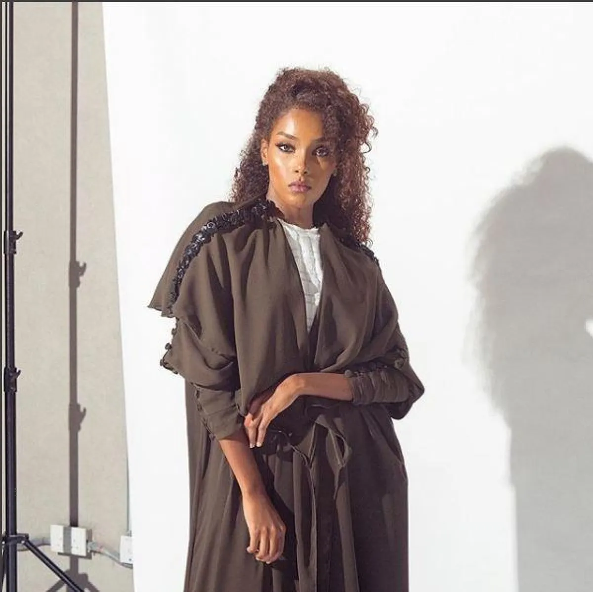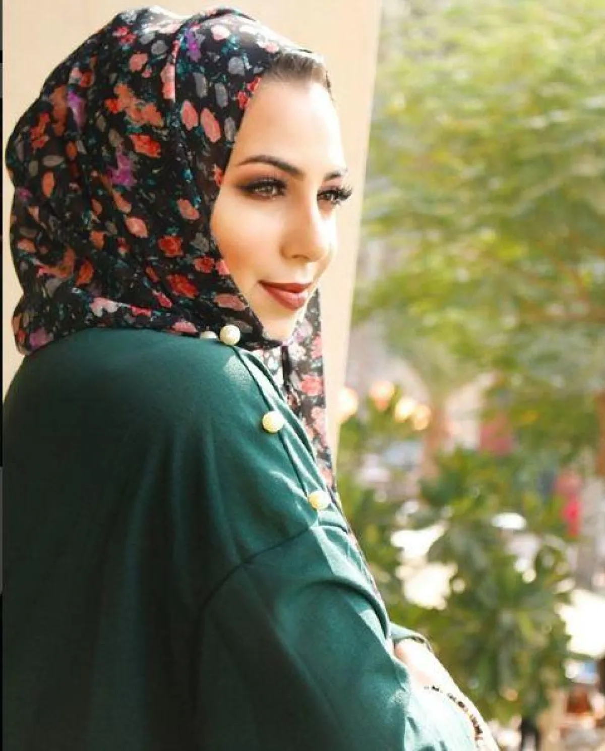 لأوقات العمل النهارية، يمكنكِ اختيار العباية بالألوان الهادئة والبسيطة، مثل هذا الأخضر من تصميم Abaya Addict عباية أديكت، مع تطاريز الأزرار الذهبية على الأكتاف.
