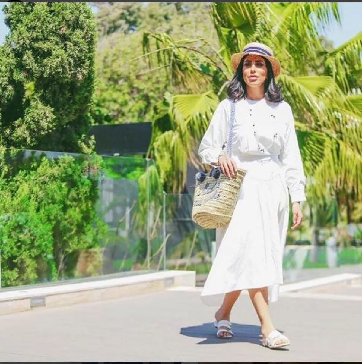 اختيار السليبر لإطلالة الشاطئ العصرية مع الفساتين الصيفية، مثل هذه الإطلالة الأنيقة الحيادية من مدونة الموضة الخليجية دانا الطويرش، مع قبعة الشاطئ والحقيبة المصنوعة من اللحاء.