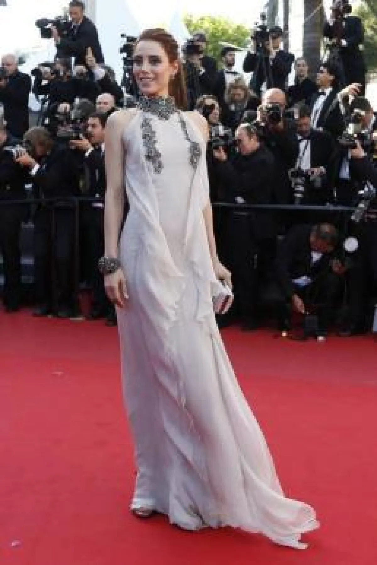 ولفتت النجمة الشابة ساديت أكسوي الأنظار بأناقتها اللافتة، التي حملت توقيع المصمم العالمي فالنتينو ودار شوبارد للمجوهرات المستمرة في إعارة مجوهراتها الثمينة للنجمات من كافة أنحاء العالم، رغم تعرضها للسرقة لأول مرة في مهرجان "كان" السينمائي الشهير.