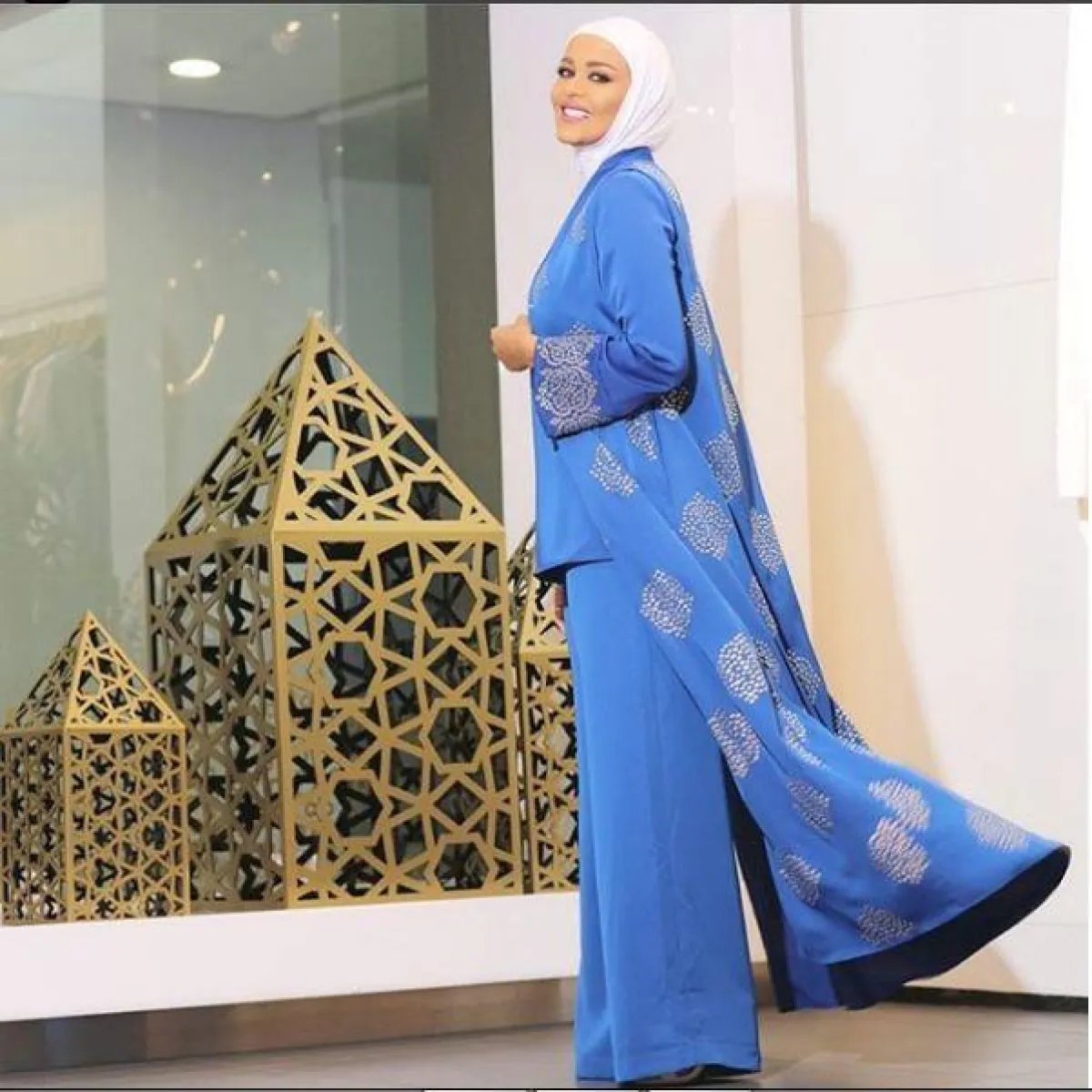 تألقت مدونة الموضة المحجبة مرمر محمد بعباية مفتوحة باللون الأزرق، وبنطلون واسع، وتوب طويل.