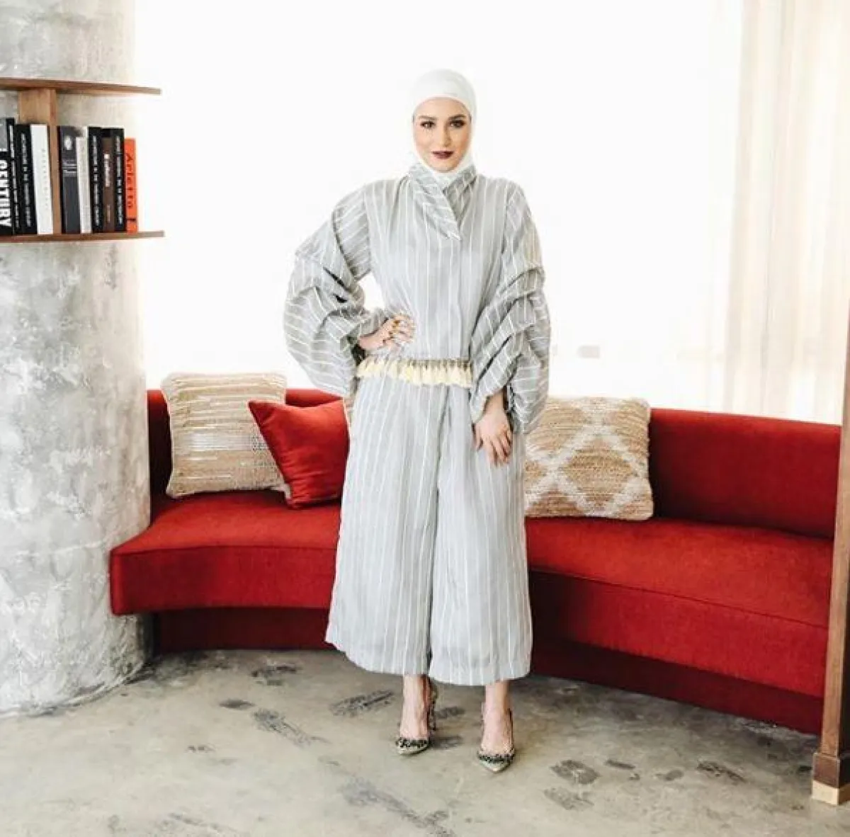 أعجبتنا أيضًا إطلالة الفاشنيستا دلال الدوب بعباية مخططة بالطول جاءت بتصميم الجيب بنطلون، تزينها كشاكش في نهاية الأكمام، مع شراشيب عصرية من ناحية الخصر.