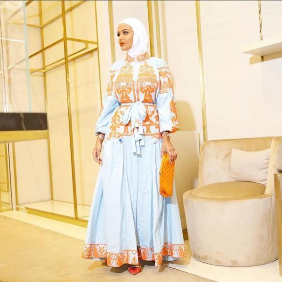 كما لفتنا اختيار مرمر عباية مصنوعة من قماش ناعم مهدول بلون البيبي بلو الفاتح، مع حزام خصر مطرز، ونسقت معها كلتش باللون البرتقالي بنفس لون التطريزات.