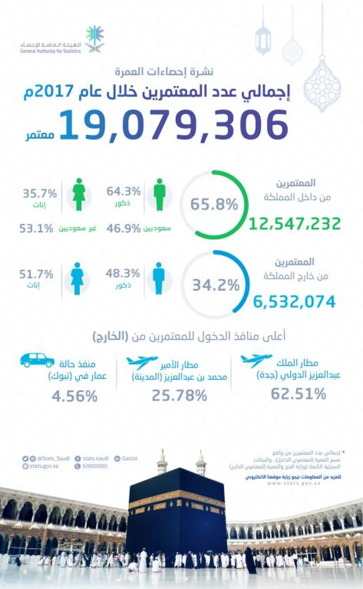 ووفِقًا لنتائج نشرة إحصاءات العمرة للعام الماضي، فقد بَلغَ إجمالي عدد المعـتمريـن 19.079.306 معتمرين؛ منهم 6.532.074 معتمرًا قدِموا من خارج المملكة وفق البيانات السجلِّية لوزارة الحج والعمرة، بينما بَلغَ عدد معتمري الداخل من السعوديين وغير السعوديين 12.547.232 معتمرًا من واقع نتائج مسح العمرة الذي أجرته الهيئة العامة للإحصاء؛ وقد بَلغَت نسبة المعتمرين السعوديين من معتمري الداخل 46.9%، بينما بَلغَت نسبة المعتمرين غير السعوديين من داخل المملكة 53.1%، فيما كانت نسبة الذكور من معتمري الداخل 46.3% ونسبة الإناث 37.7%.