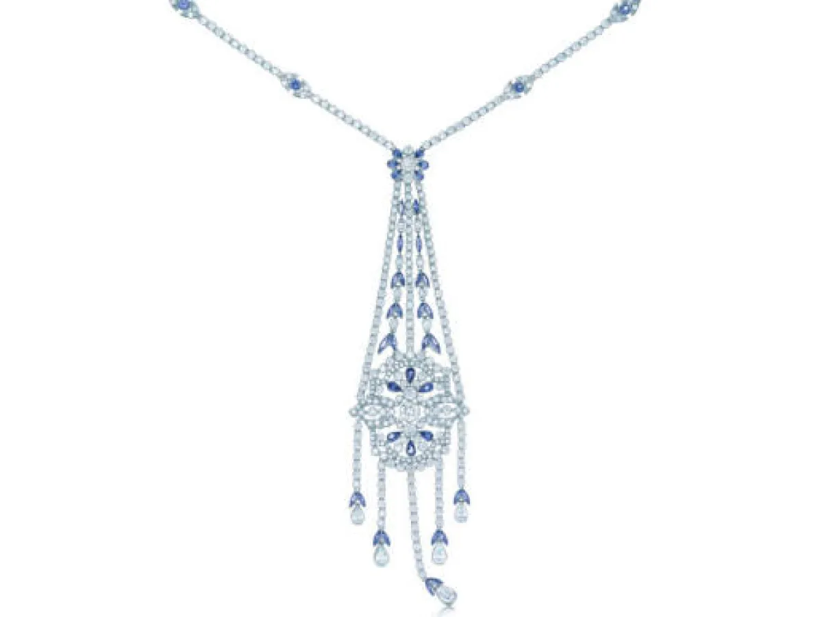 اخترنا لك هذه القلادة من مجموعة 2013 Blue Book Collectionالجديدة من تيفاني، وهي مصنوعة من الذهب الأبيض ومرصع بالماس وحجر السافير الأزرق. تعكس مجموعة Blue Book الإرث العريق للعلامة التجارية، وتتضمن قطعاً من الحليّ التي رُصّعت بأفضل الأحجار الكريمة، من عقود وأقراط ماسية وأساور مرصعة بالماس المدور وماس الباغيت . وفي بعض القطع يتباين الماس مع العقيق اليماني المصقول باليد، فيما رُصِّعت المجوهرات بماسات فخمة على شكل إجاص، مُحدثة فيها سِمة مميزة، فتبدو وكأنها تضجّ بالحياة وتتماوج كحرير مرهف رقيق.