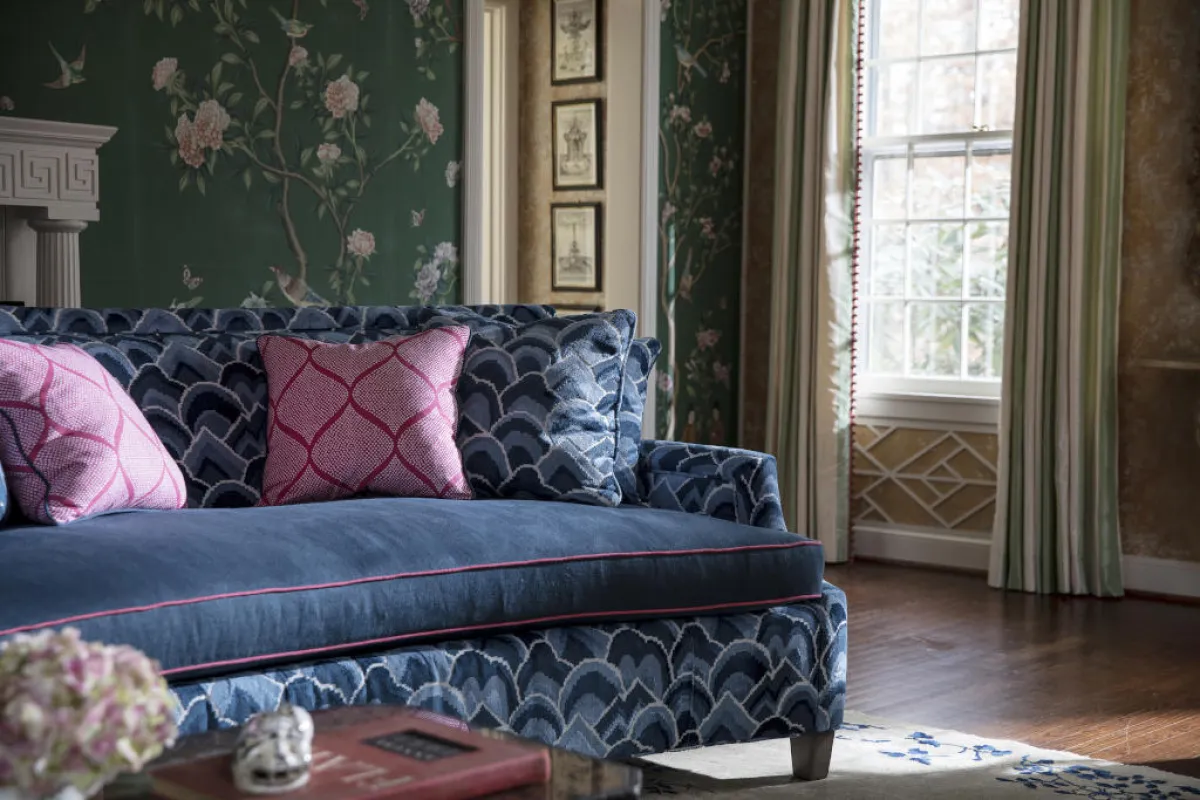 إشارة إلى أنَّ النقوش الطبيعيَّة ذات الألوان الغنيَّة، على الأقمشة الفخمة ذات الخلفية السوداء أو الكحليَّة، تجعل المكان رسميَّ الطابع وأنيقًا، في مُقابل النقوش الفاتحة والخلفيَّات البيض التي تجعل المكان يبدو عائليًّا أكثر وبسيطًا. وعند مُلاحظة أنَّ النقوش والألوان تُثقل المكان، من المُمكن الإبقاء على مقاعد الأريكة سادة، وجعل ظهرها منقوشًا، فيصبح حيتئذ الأثاث بتفاصيله هو محور الغرفة، وليس الإكسسوارات الجانبيَّة.