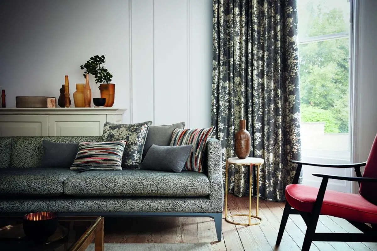 في الجلسات العصريَّة الأنيقة، سواء كانت رسميَّة أو عائليَّة، يُناسب اختيار الأقمشة المنقوشة بنقوش حيويَّة كبيرة الحجم نسبيًّا، ما يُكسب المساحة هويَّة مميَّزة، مع إضافة بعض الأقمشة السادة إلى المكان، بُغية إراحة العين، أو أقمشة مغايرة في الألوان لفرض هويَّة الديكور.