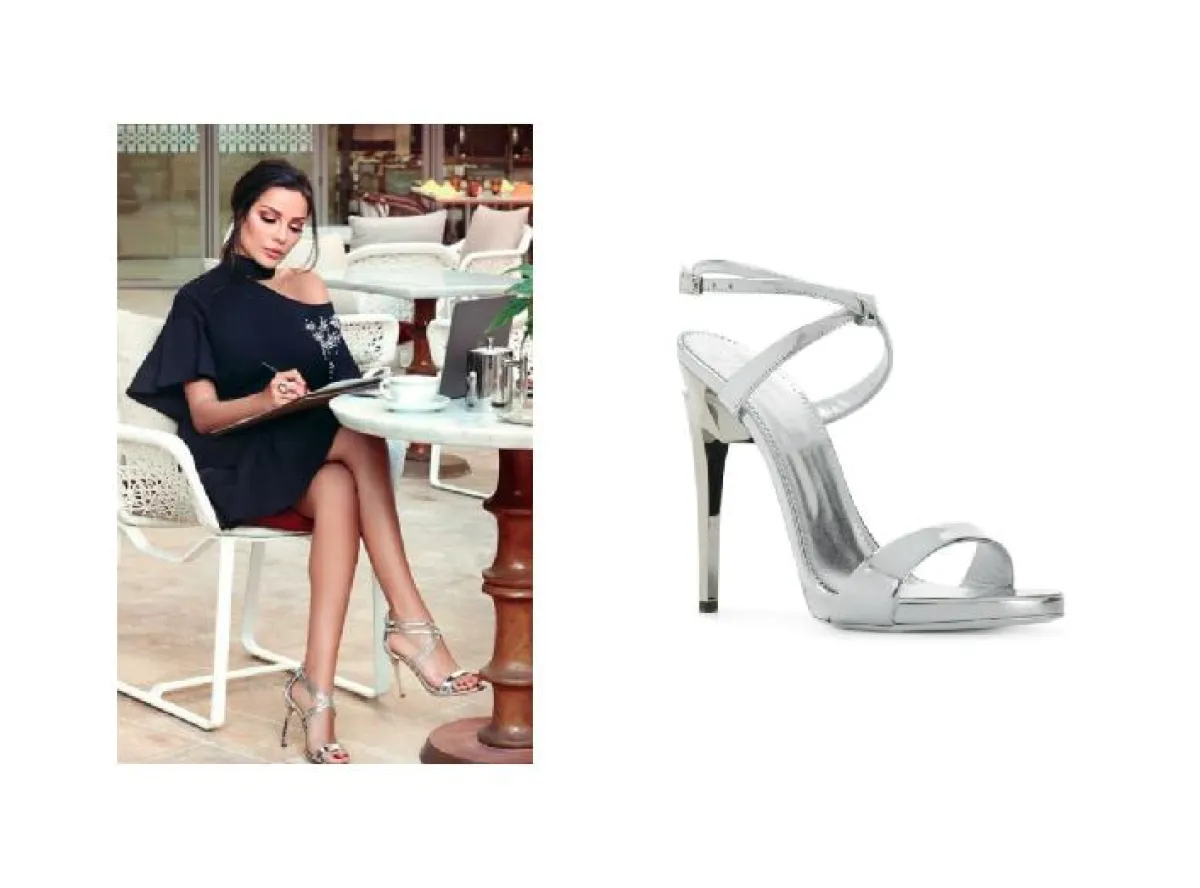 مع الفستان الأسود اختارت نادين نجيم صندل باللون الفضي المعدني وقد أضاف هذا الصندل لمسات عصرية لتصميم الفستان الناعم.