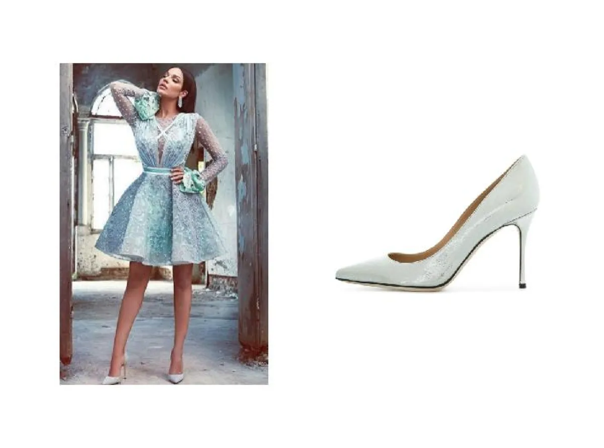مع فستان أزرق قصير نسقت نادين نجيم حذاء باللون الأزرق المعدني أيضاً بدرجة فاتحة وقد بدا اللوك متناغم وأنيق.
