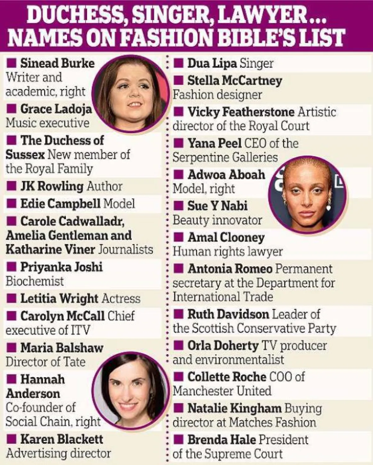 وبحسب القائمة التي نشرتها Vogue البريطانية، والتي تُعنى بشؤون الموضة، فقد اختيرت دوقة ساسكس ماركل إلى جانب السياسية الاسكتلندية روث ديفيدسون، ومصمِّمة الأزياء ستيلا مكارتني Stella McCartney ، مؤلفة روايات هاري بوتر جيه كيه رولينج J. K. Rowling، أمل كلوني وغيرهن...