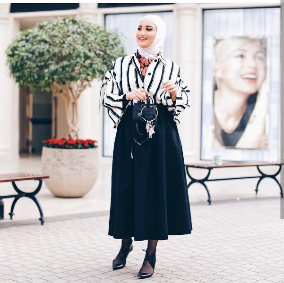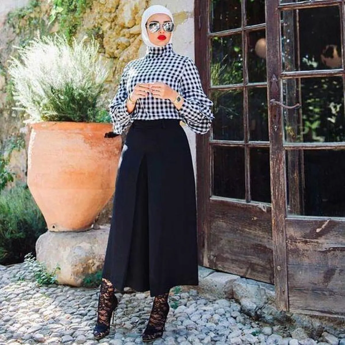 تميل المدونة الخليجية مرمر محمد إلى ارتداء التنانير عالية الخصر، التي تناسب ذوقها الكلاسيكي الفخم، لهذا اخترنا لك هذه الإطلالة بالتنورة السوداء، مع جورب دانتيل ناعم وكعب عال، وبلوزة كاروهات، ولفة الحجاب الكويتية باللون الأبيض.