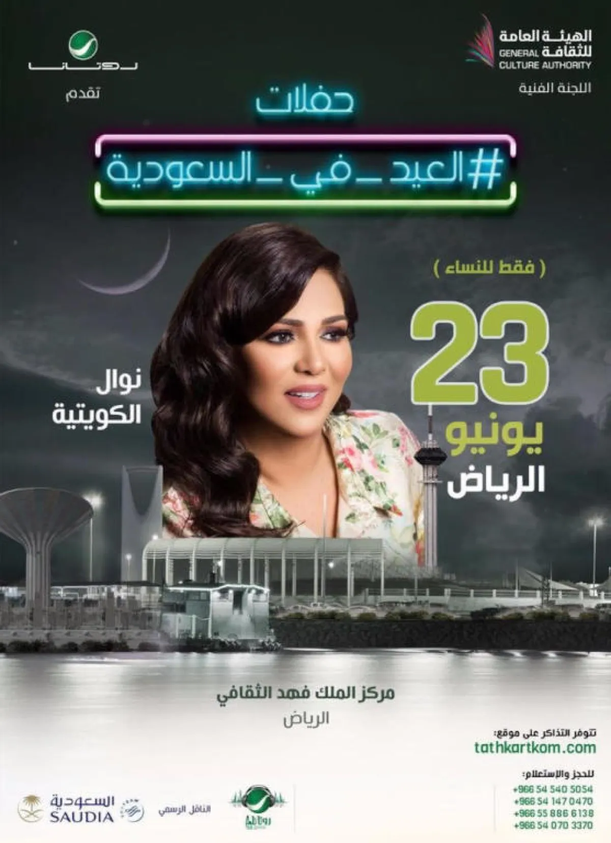 أما آخر الحفلات المجدولة ضمن حفـلات العيد، فستحييه الفنانة نوال الكويتية في الرياض، وسيكون مخصَّصاً للنساء في 23 يونيو.