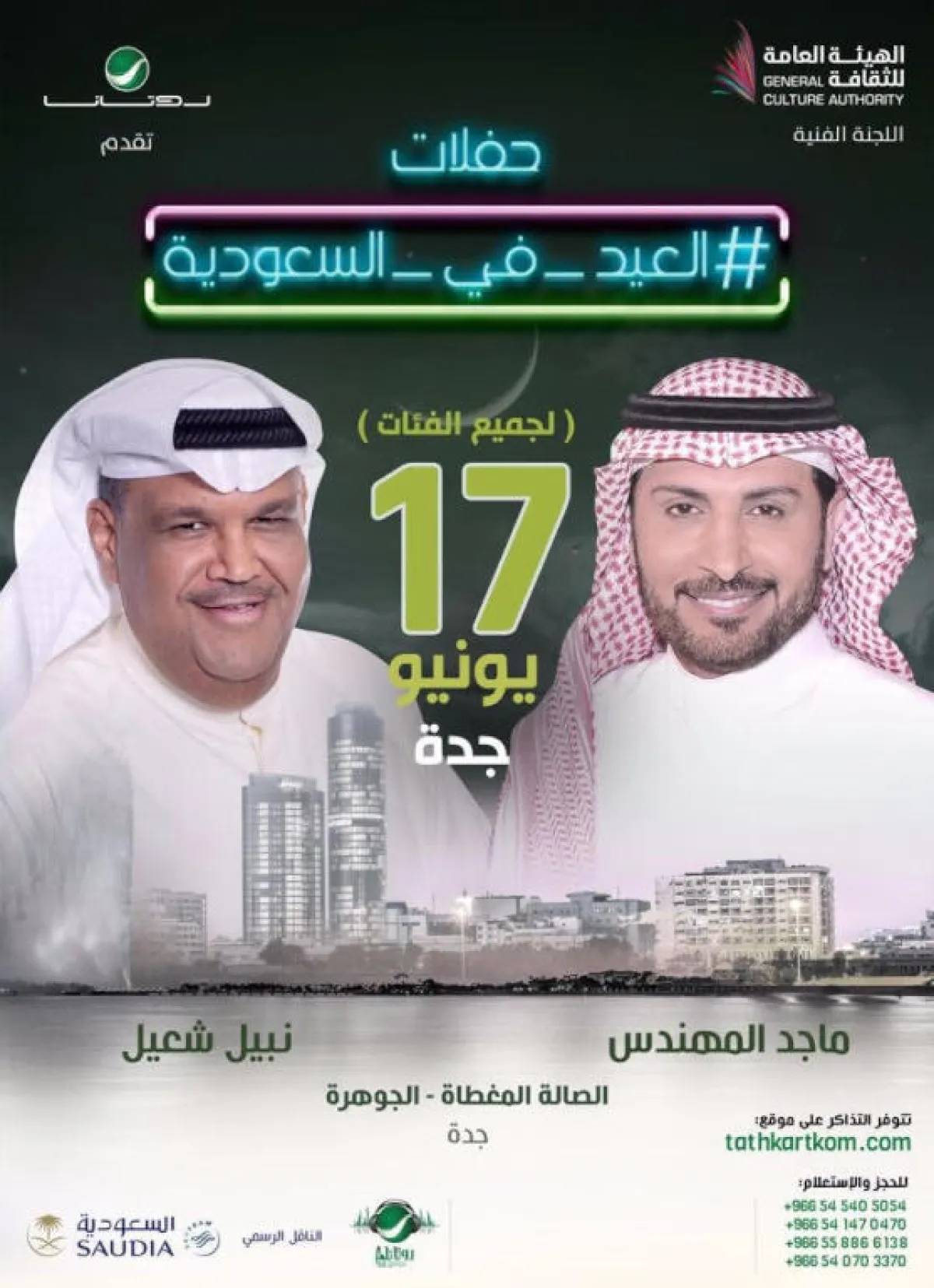 وسيفتتح الفنانان ماجد المهندس، ونبيل شعيل حفلات العيد في السعودية، في 17 يونيو، حيث سيحيي النجمان حفلاً غنائياً مشتركاً في الصالة المغطاة بجدة التي تتسع إلى أكثر من 6000 شخص. وكان المهندس أحيا حفلتين بتنظيم من "روتانا" العام الماضي في جدة، نهاية يناير الماضي، وفي مسرح مركز الملك فهد ضمن حفلات عيد الفطر 2017.