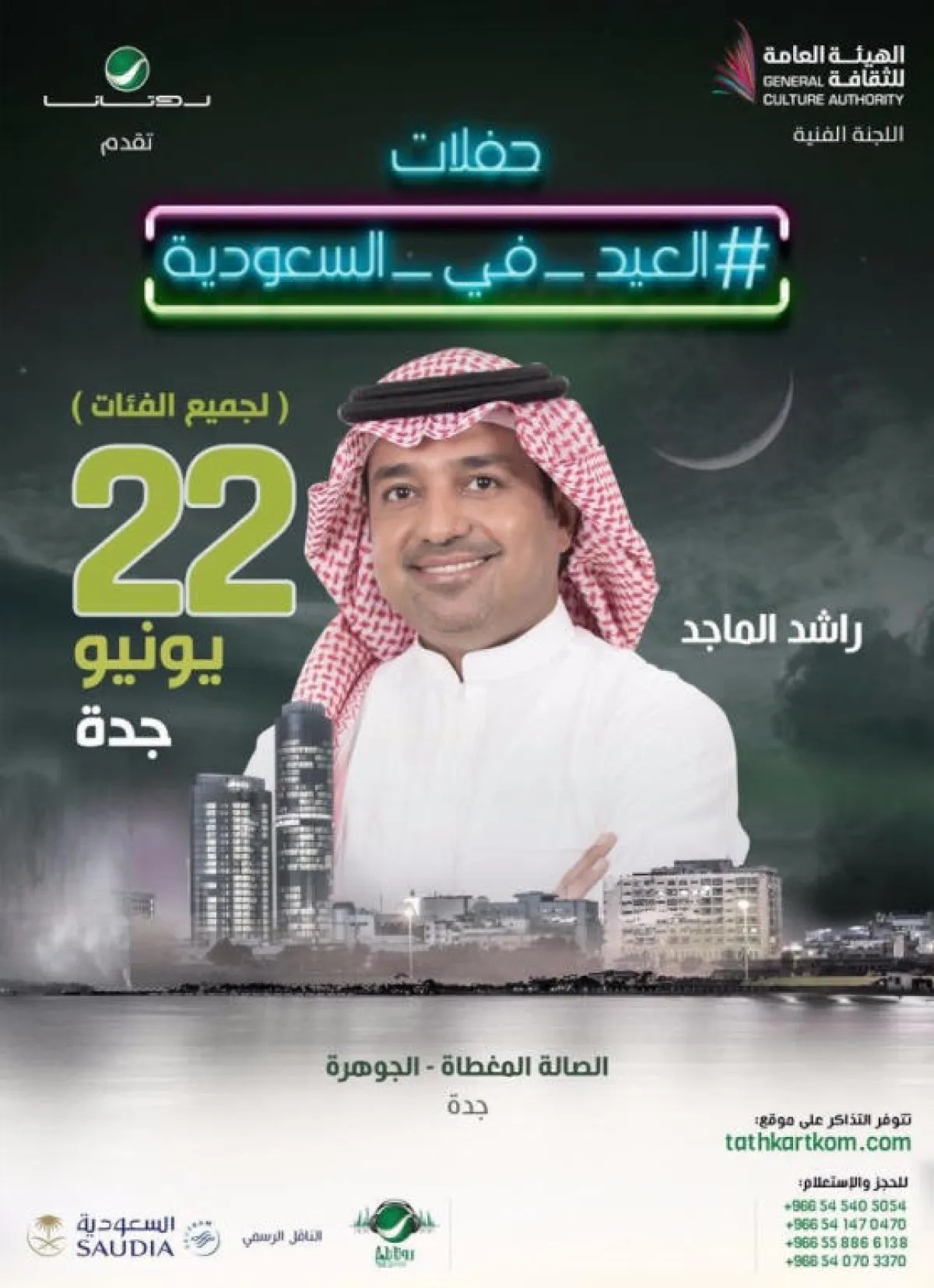 وضمن مفاجآت العيد السارة، سيحيي النجم راشد الماجد حفلاً غنائياً كبيراً، يجمع بين النغم الأصيل والطرب. ويعد راشد ركناً أساسياً من أركان الفن السعودي. وسيصدح الفنان المتألق منفرداً في الصالة المغطاة بملعب الجوهرة المشعة في جدة، وقد شارك الماجد في حفلات عدة بالسعودية، منها حفلته في الرياض، مارس 2017، ومشاركته في حفل اليوم الوطني، وآخر أقيم بمناسبة تأهل المنتخب السعودي إلى كأس العالم، وستضاف حفلته في جدة إلى رصيد حفلاته الكبرى في السعودية.
