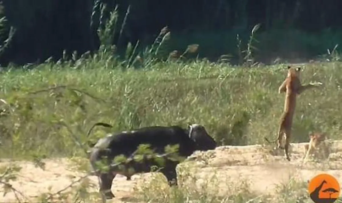ثم ظهر الجاموس المنقذ للتمساح من أنياب الشبل، قبل أن يقضم ظهره، وأجبره على إطلاق سراح فريسته؛ بنطحه بقرونه، بعيدًا عن التمساح.