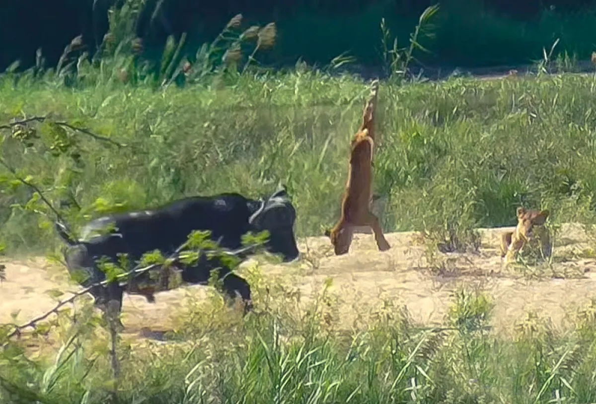 أنقذ جاموس تمساحًا صغيرًا من أنياب الأسود، ما جعل أحدها يطير في الهواء، بينما خافت الأخرى وهربت.