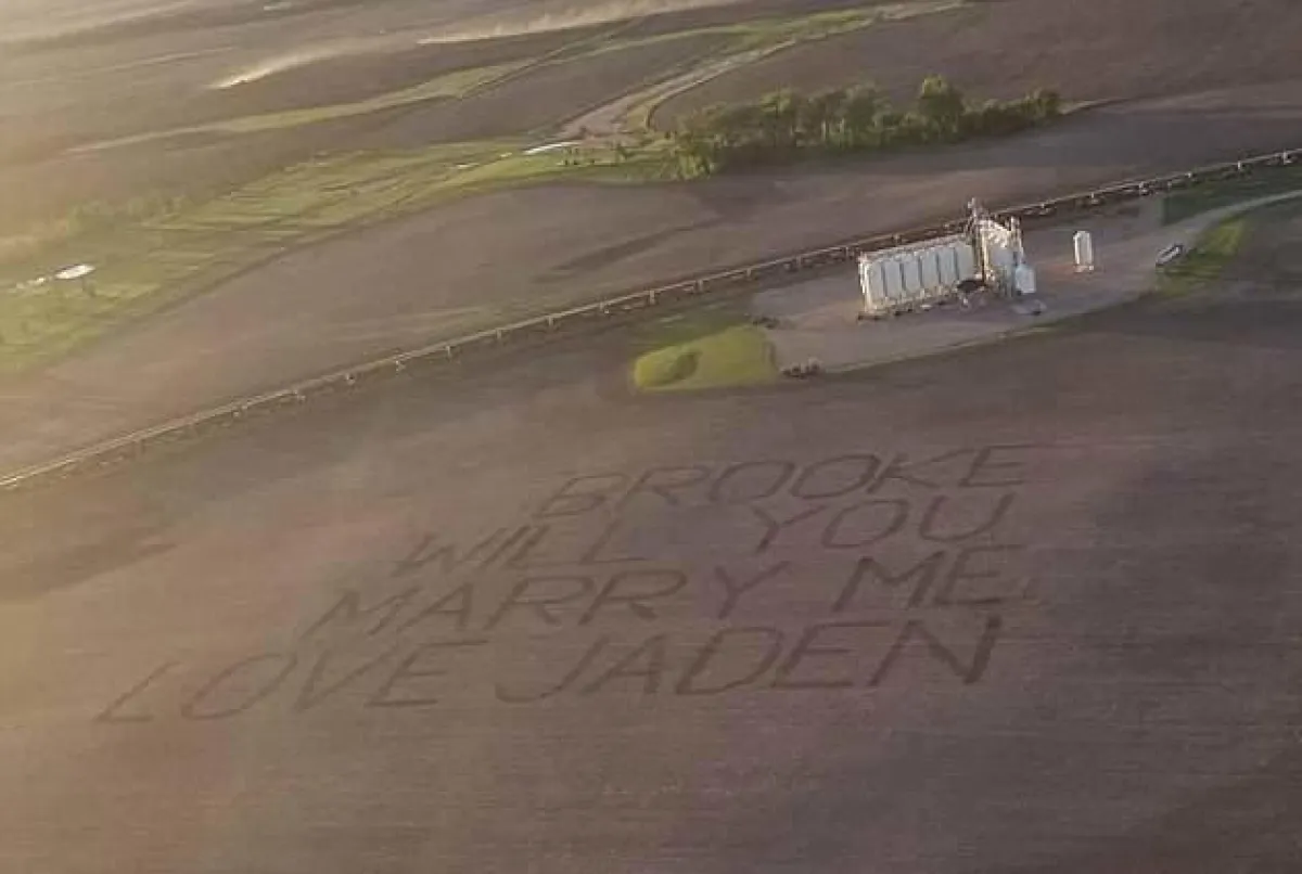 و نقش مهندس الكمبيوتر جيدين ويرانغا من ولاية نورث داكوتا الأمريكية على حقل بأرضية مزرعة جده عبارة "بروك.. هل تقبلين الزواج بي؟" ثم اصطحب حبيبته بروك بيسك في رحلة على متن طائرة خاصة فوق المزرعة كي يعرض الزواج عليها.