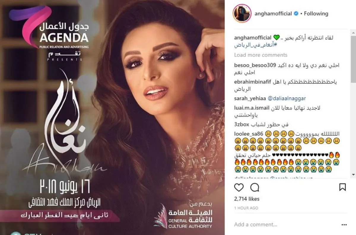 يُذكر أنّ المطربة أنغام، أعلنت، فجر يوم الإثنين عن إقامة حفلة في المملكة العربية السعودية، وتحديدًا بمدينة الرياض، في عيد الفطر، وكتبت الفنانة عبر حسابها الموثق على موقع تويتر: "لقاء انتظرته.. أنغام في الرياض أراكم بخير أقضي معكم العيد.